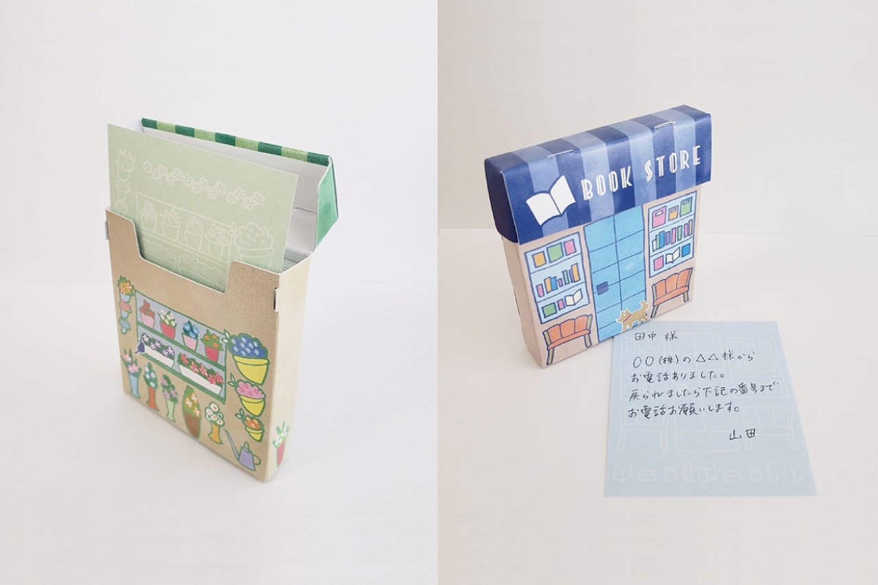 「箱入りメモ」は、カフェ、フラワーショップ、スイーツショップ、ブックストアのお店をイメージしたパッケージデザインが可愛いメモシリーズ。スリムなパッケージサイズにメモを立てて収納できるので、引き出しの中やPCの前にもスッキリ収まる。各デザインを集めればまるで街並みのよう。オフィスや学校のデスクの上を賑やかに彩ってくれる。