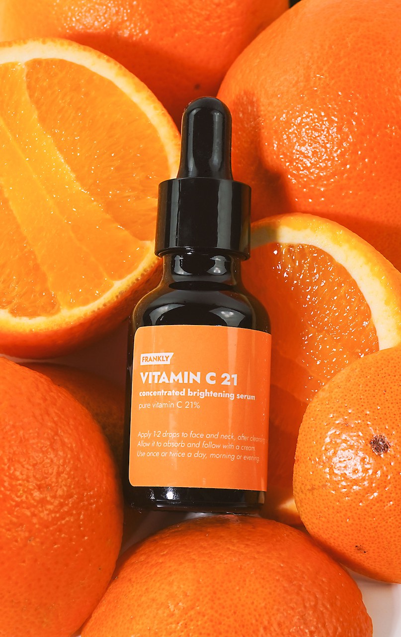 FRANKLYのビタミンセラムは、イギリス産純粋ビタミンCを21%配合した濃厚美容液。ビタミンC高含量テクスチャー特有のべたべたした使用感を解決し、すっきりしたつけ心地に仕上げた。