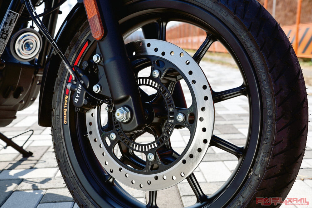 定評のあるバイブレ製キャリパーとφ300㎜ローターを組み合わせたフロントブレーキ。あたりの出ていない走行2㎞からの試乗だったが、走り込んだ終わりごろの感触はよかった。