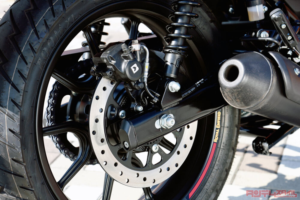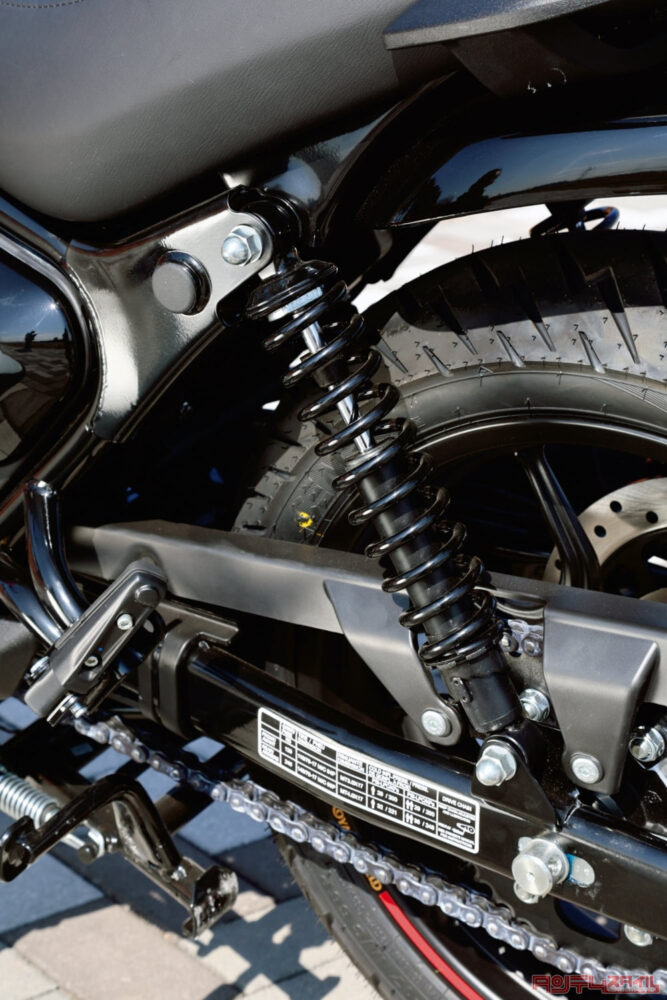 ツインショックを採用するリヤサスペンション。エンジン同様黒で統一されていて、足まわりを引き締める一因になっている。スプリングのプリロードを6段階で調整が可能。
