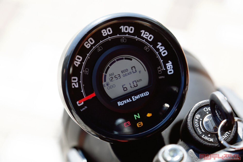アナログの指針で速度が表示され、その中央部に液晶モニターが配されるメーター。モニターには燃料残量、走行距離、時刻、ギヤポジションといった情報が表示される。