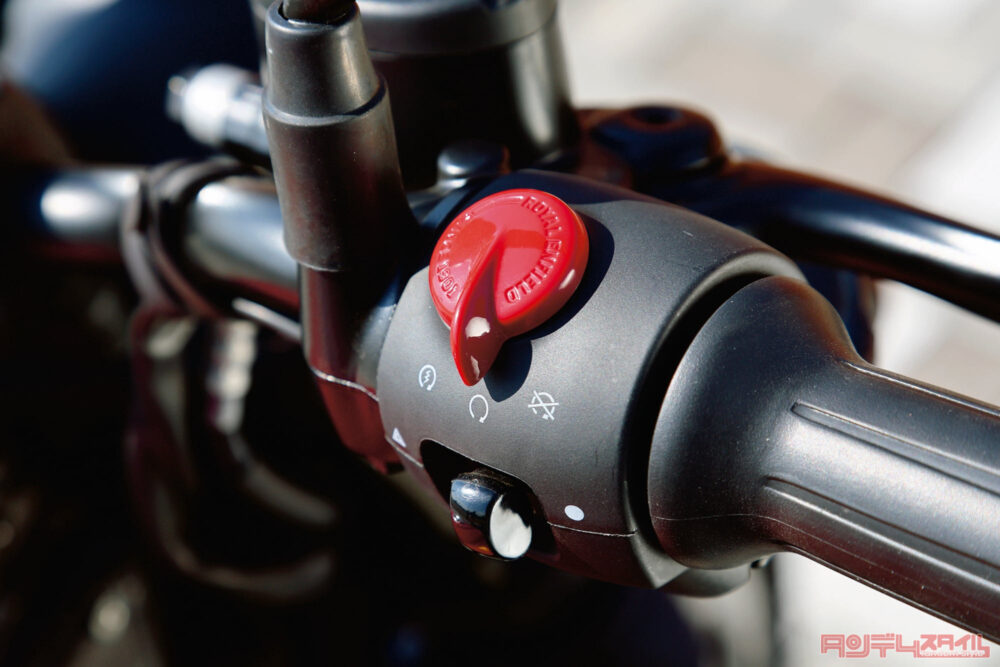 右ハンドルスイッチボックスには、キルスイッチ一体型のスタータースイッチとハザード用の二つのスイッチのみが配される。グリップはまん中がふくらむ樽型となる。