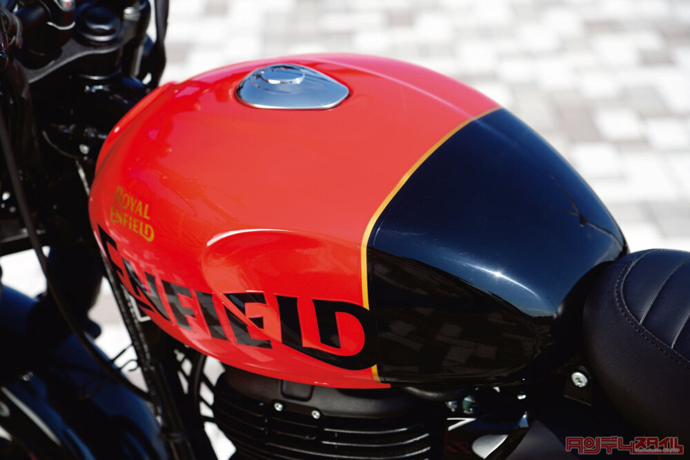 ガソリンタンクはライダー側のサイドがえぐられることで、ニーグリップがしやすくなっている。キャップがヒンジでタンクとつながっているので、給油時にストレスを感じない。