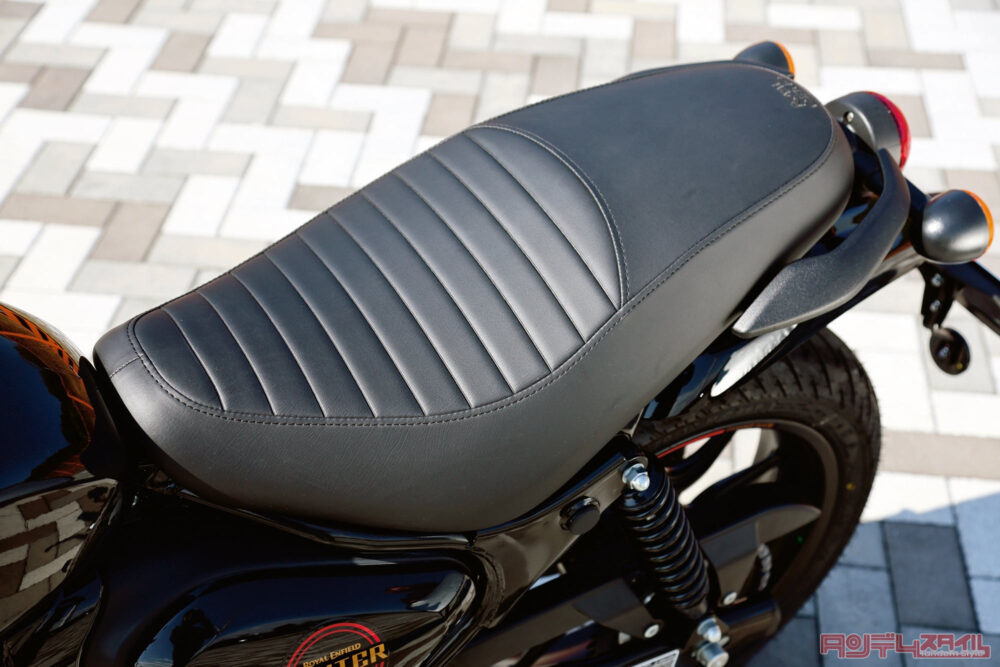 ライダー乗車部分がタックロールになった一体型シート。縫い目にステッチが入ったり、後端にエンボスでロイヤルエンフィールドのロゴが入れられており質感が高められている。