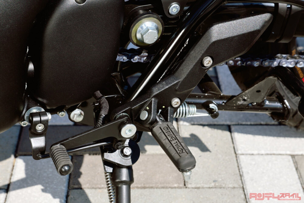 ステップはベースプレートがヒールガードになっていてヒールグリップもしやすい。シフトチェンジペダルの靴があたる部分は靴が傷まないようゴムでおおわれていて操作性もいい。