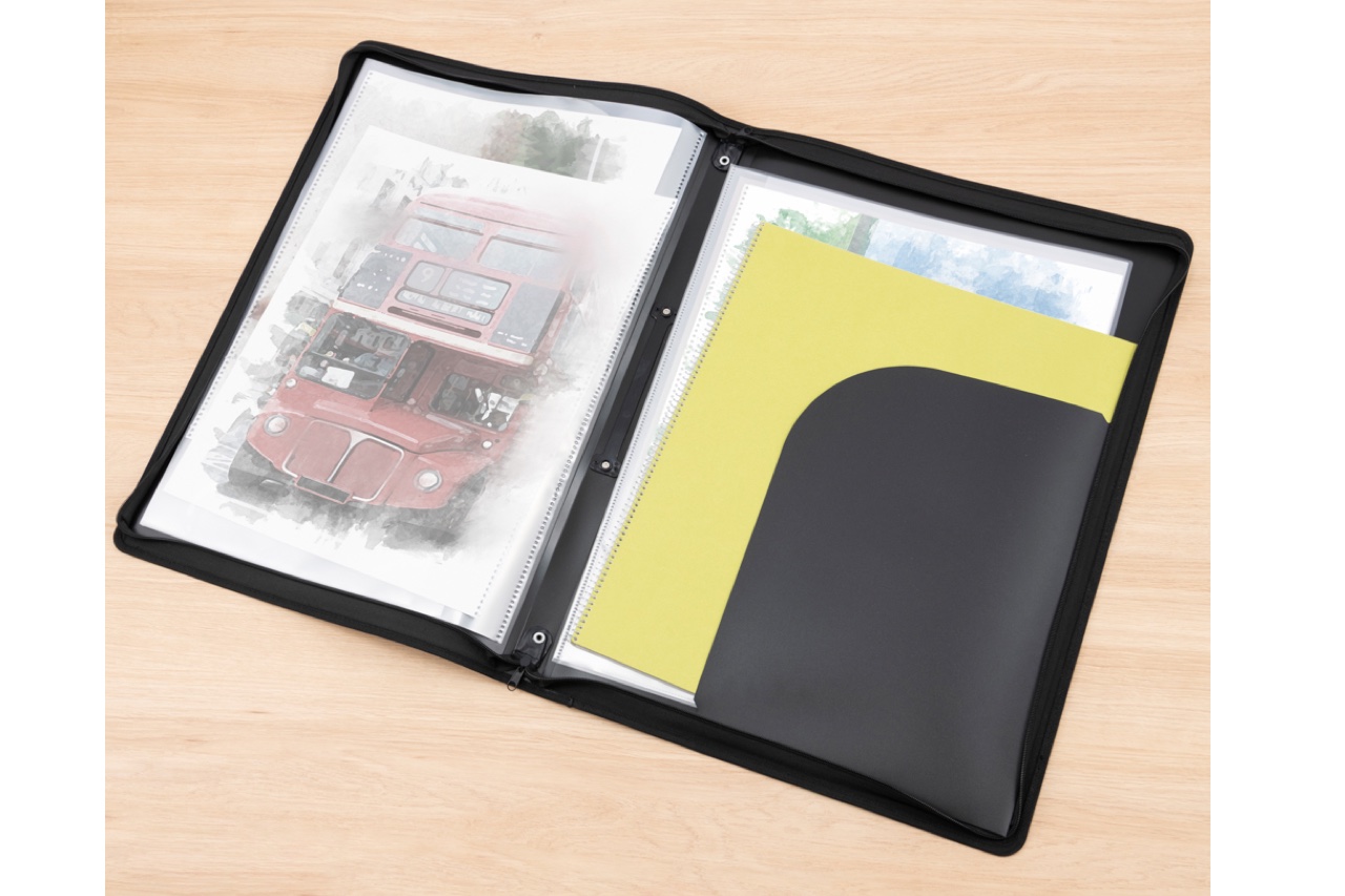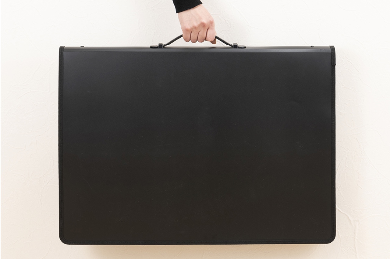 「アーテム グラフィックケース」は、作品ポケットとマチ付きポケットが付いた画用紙サイズの収納ケース。一般的なケースは内部に仕切りが無く作品を保管するとケース内で折れや反りが起きてしまうことがあるが、同製品は作品ポケットに一枚ずつ収納できるため作品をしっかりと保護できる。また、マチ付きポケットが付属しているため、スケッチブックや同シリーズのファイルなど厚みのある物(10mm 厚まで)もまとめて収納できる。