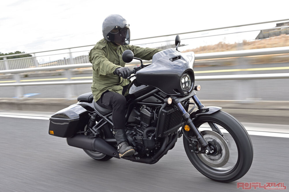 試乗した日はものすごく寒かったからフロントカウルの効果は一般道でもわかった。低いスクリーンなのでヘルメットには風を感じるが、上半身の肩から下は風を防いでくれた。当然だけど確実に効果はある。サイドケースはハンドルバーの幅に収まっている。直進ならハンドルバーがあたらずに通過できたらぶつけない。ただ曲がりながらの場合は少なからず内輪差があるから意識しよう。ホンダらしくクセのないハンドリングで、ペースを上げて走っても戸惑うところがない。寝たフォークもスムーズに動いて、ブレーキでの速度制御も問題なし。ミッドコントロールでヒザの曲がりが90度に近いから、ペグを踏み込んで動かすのがやりやすいのもいい。ワイルドな見た目ながら汎用性が高いのがレブル1100Tの実力。そして魅力。