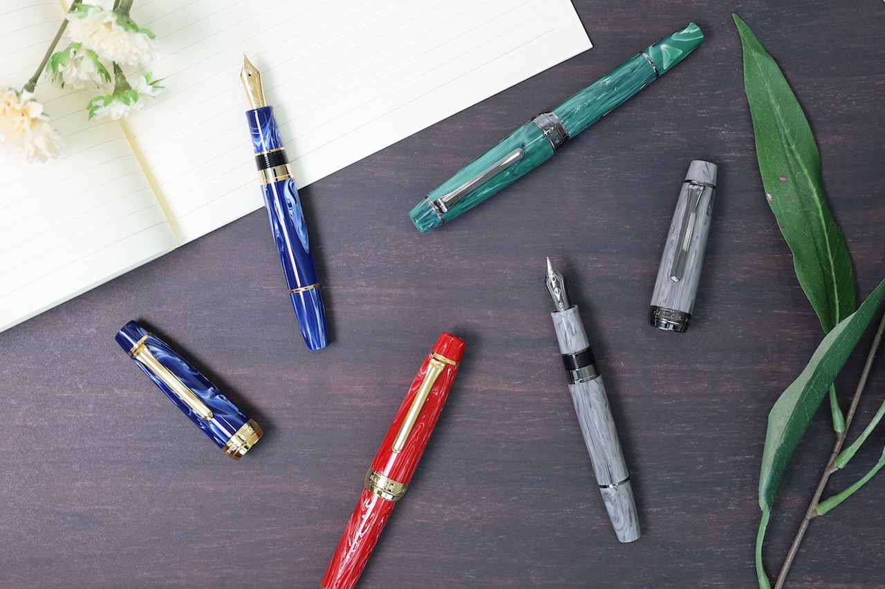 カラーはマーブルのレッド、ブルー、グリーン、グレーの4カラーと、不透明色のブラックを合わせた計5カラー。ペン先及び金属パーツはゴールド、シルバー、ブラックの3種類からカスタマイズ可能。大先パーツはメタルも選択可能となっている。