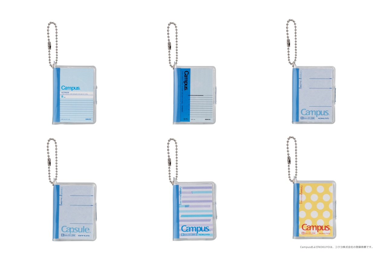 本商品は、コクヨが1975年の発売以来、進化し続ける「キャンパスノート」を全高約5.4cmの手のひらサイズにしたミニチュアチャーム。歴代のキャンパスノートデザインの一部や、「Campus」の文字が「Capsule」になった、ガシャポン®︎オリジナルデザインなどを含めた全6種をラインナップ。