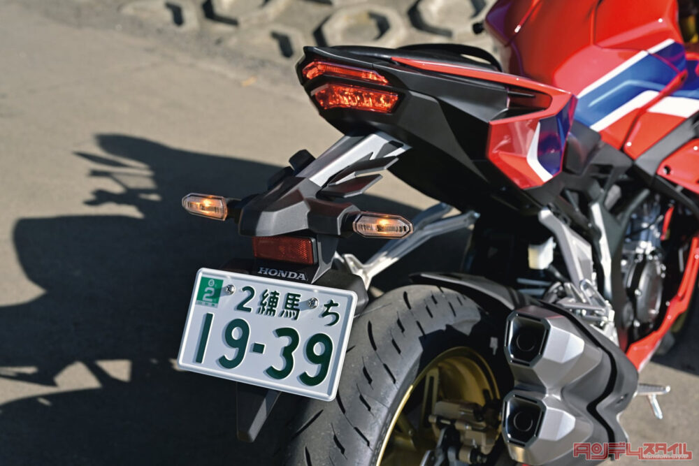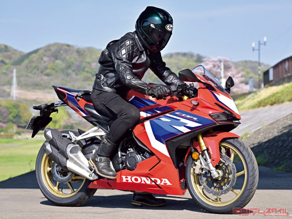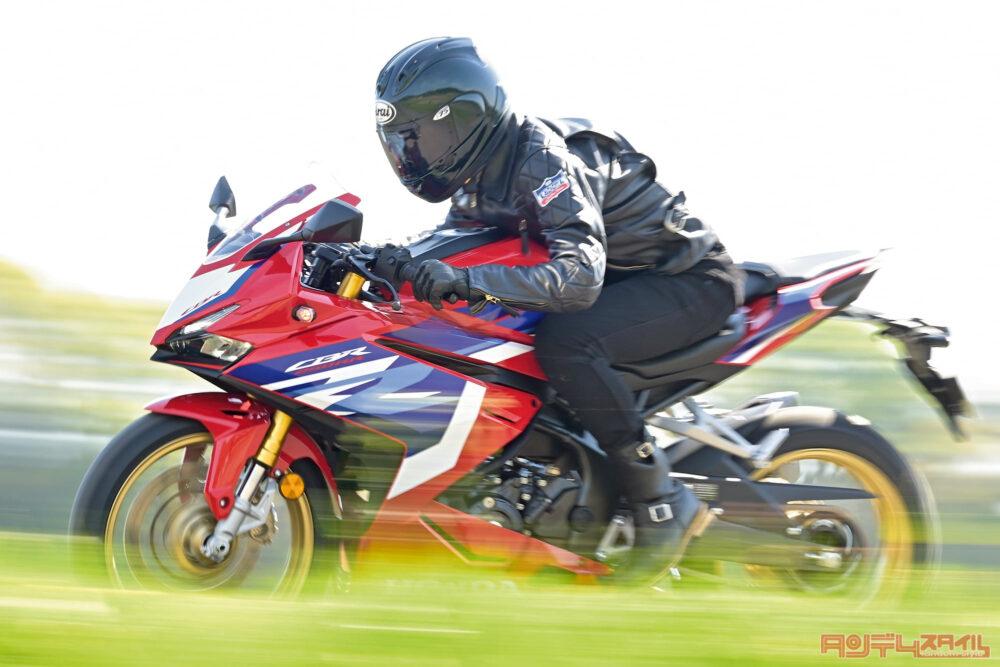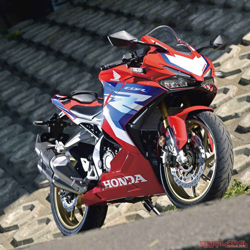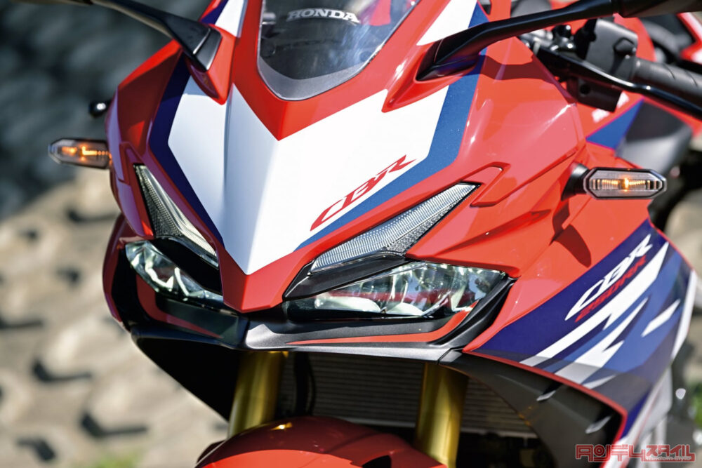 まずはCBR250RRのスタイリングから。真横、正面、バックスタイルを確認してほしい。前モデルからデザインが変更され、シュラウド、特徴的な上下二眼ヘッドライトの形状なども新しくなっている。カラーラインナップはグランプリレッド(写真)、パールグレアホワイト、マットバリスティックブラックメタリックの3色。