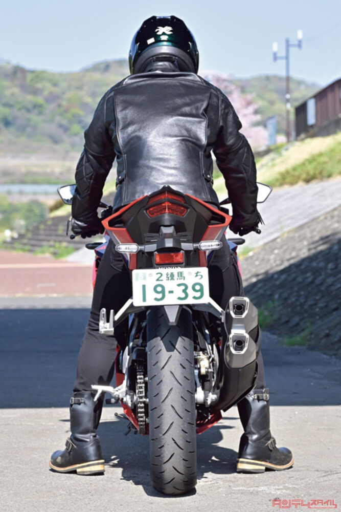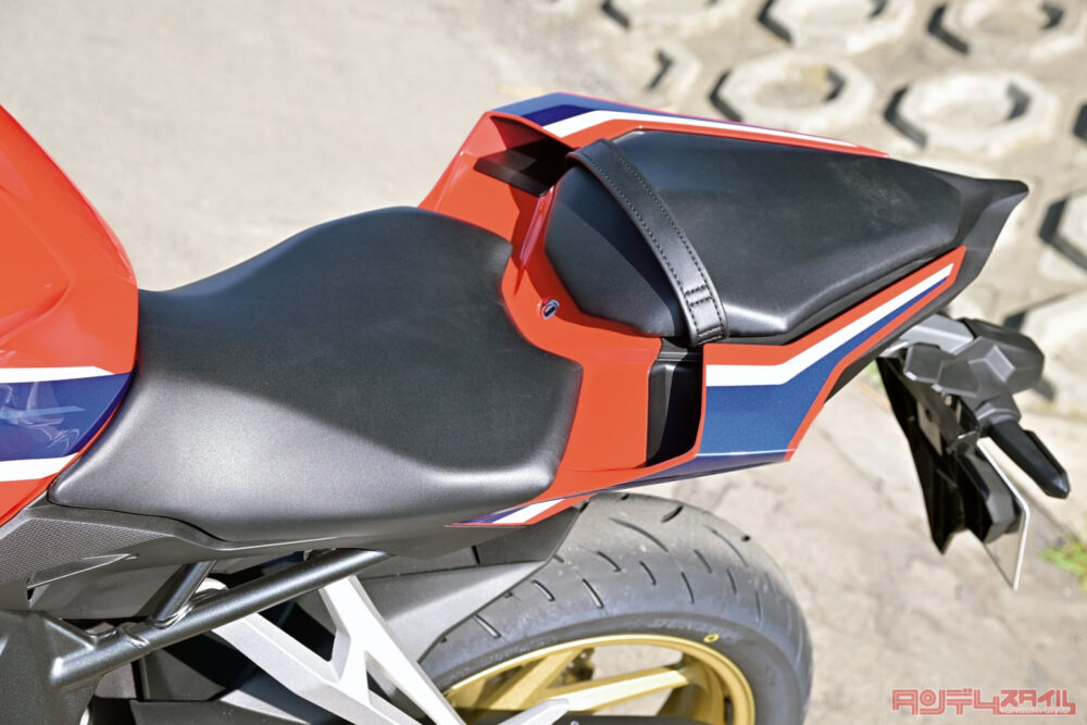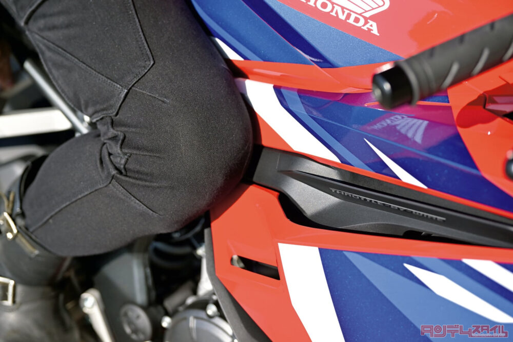 フルカウルスポーツというと足つきが悪そうに思いがちだが、シート高790㎜の数値で余裕の足つき。前傾姿勢にはなるが強すぎず、1日中乗っていたがキツイ印象はなかった。下半身は窮屈すぎず、ダルすぎず、いい感じだ。
