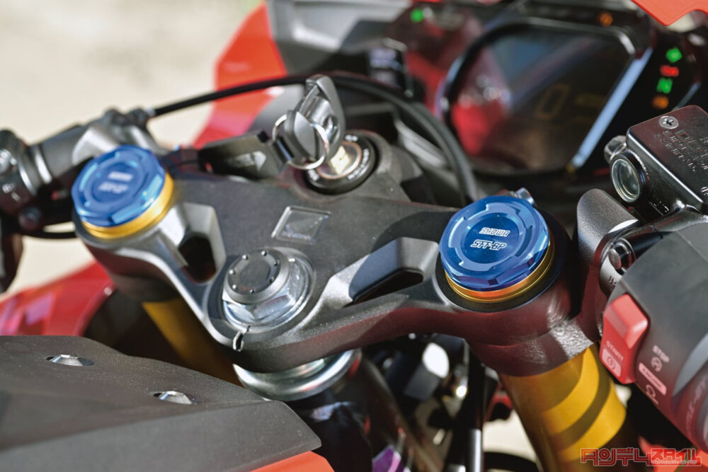 前モデルは、フロントフォークの片方にダンパー機構、片方にスプリング機構と左右で役割分担をしているショーワ製SFF(セパレートファンションフォーク)を採用していたが、新型はSFF-BP(ビッグピストン)になった。この違いは明らかで、速度が遅くても柔らかくスムーズな動きをして、速く大きく沈み込む減速時などではしっかりとふんばる。ダンピングもより適切で、フロントタイヤの接地感がいい。タイヤが路面を押し付けている状態をたもちやすく、切れ味のいいハンドリングに磨きがかかった。これはツーリング用途で使うときの乗り心地のよさにもつながり“そんなにスポーツライドしないよ”というライダーにも恩恵がある。