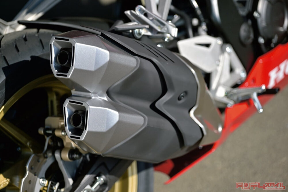 ディテールにこだわっているデザインをしたマフラー。出口をデュアルにして異なる排気音のバランスを取ることで、排気サウンドを豊かにした。