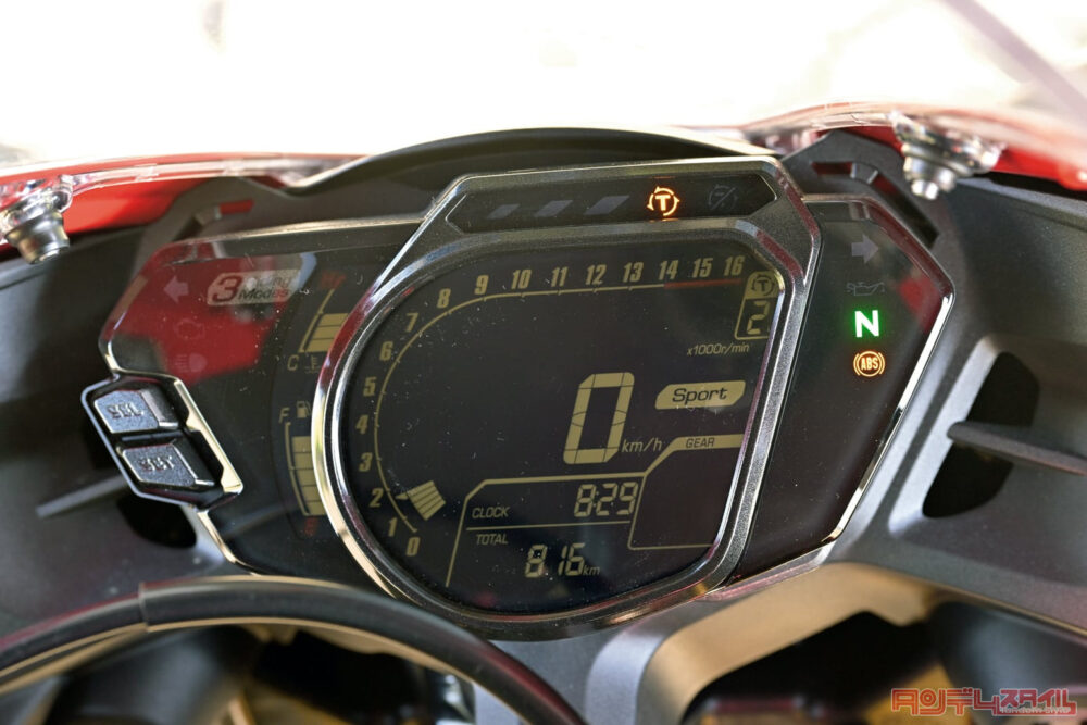 反転液晶画面の右上にある“T”と書かれた枠内の数値がセレクタブルトルクコントロールの状態。介入レベルを3段階から選べ、オフにもできる。