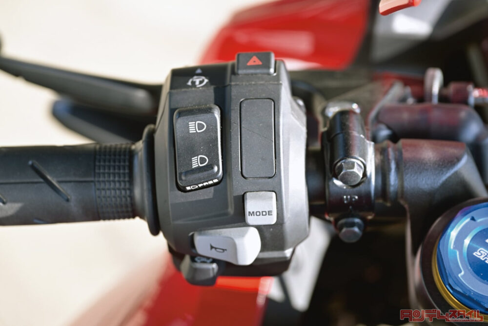 モードスイッチで簡単にライディングモードを変更できる。元気な“スポーツ+”、標準の“スポーツ”、穏やかな“コンフォート”の3つだ。