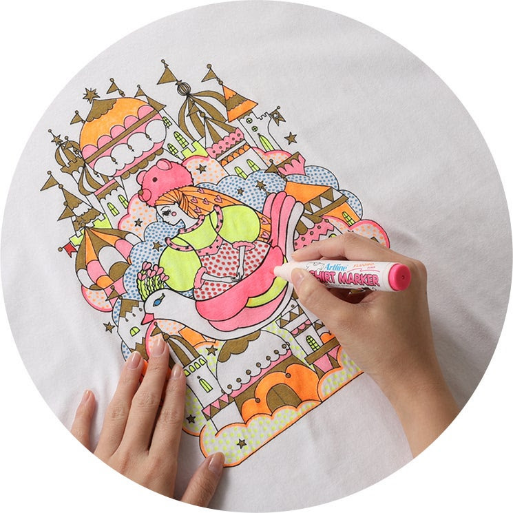シヤチハタの筆記具ブランド「Artline」シリーズにおいて海外で人気の水性顔料マーカーです。Tシャツや布のバッグなどへのイラスト描きや色付けの際ににじみにくく、耐水性・耐光性に優れています。乾燥後に中温でアイロンをかければ、耐洗濯性もあがる。