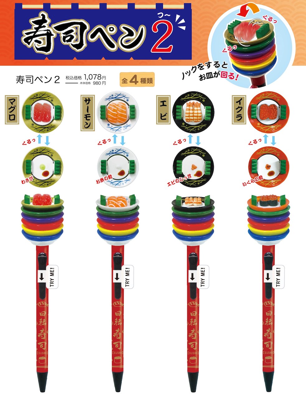オリジナル文具・雑貨などを販売するメーカー、funboxは、「お寿司が回転して消える」というユニークなギミックを搭載したボールペン、「寿司ペン」全4種類を8月31日(木)より順次発売する。