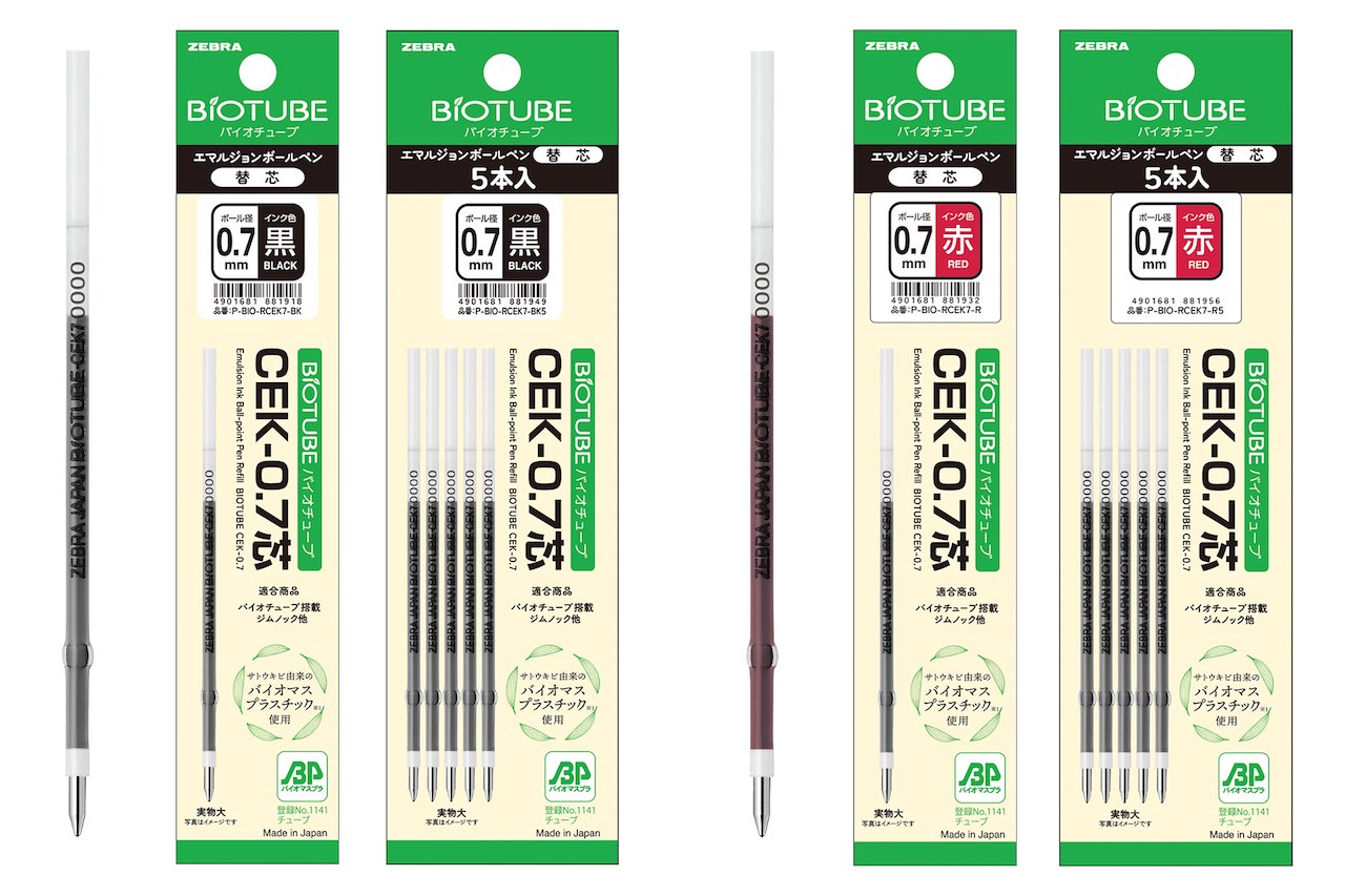 ゼブラは、インクチューブにサトウキビ由来のバイオマスプラスチックを使用した替芯『バイオチューブ CEK-0.7 芯』と、本替芯を搭載したエマルジョンボールペン『バイオチューブ搭載ジムノック』を、9月7日(木)より、全国文具取扱店にて発売。
