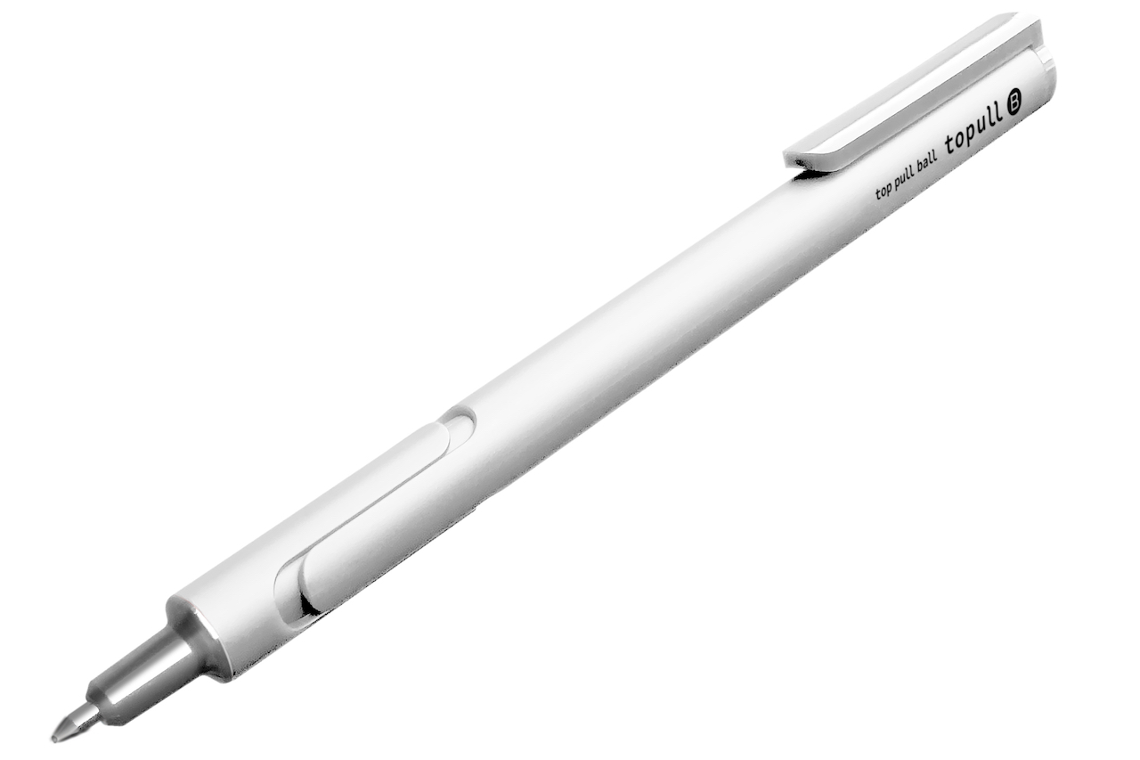 『トプルB』は、「親指でノックして芯を出す」という常識を全く新しく変えたボールペン。ペン先にノック機構があり、「2本の指で引いて芯を出す」という新しいカタチが特長だ。