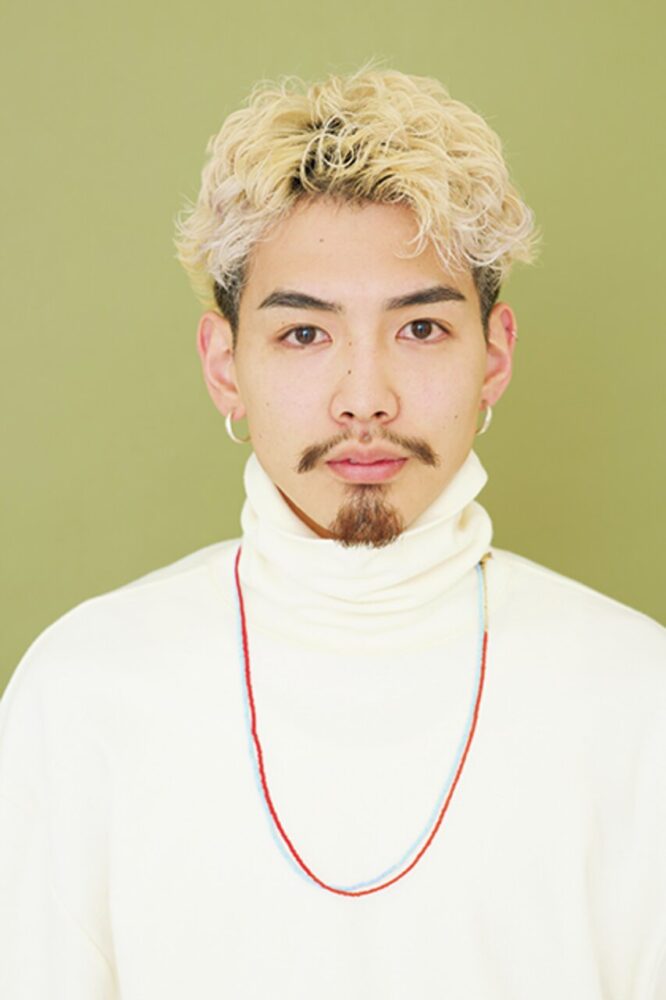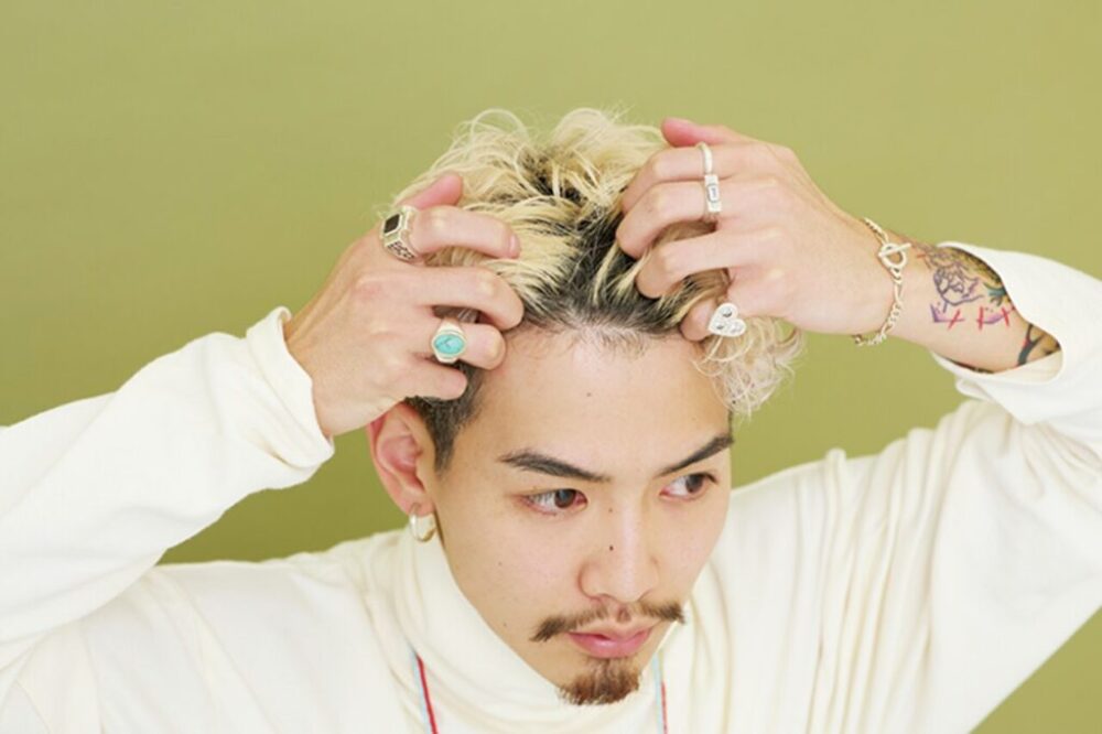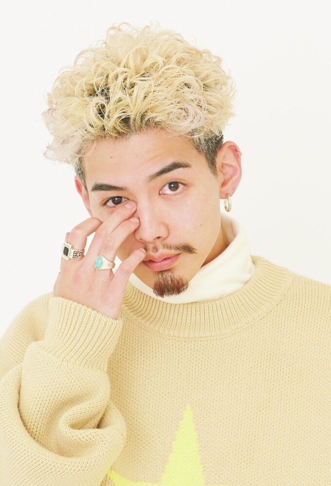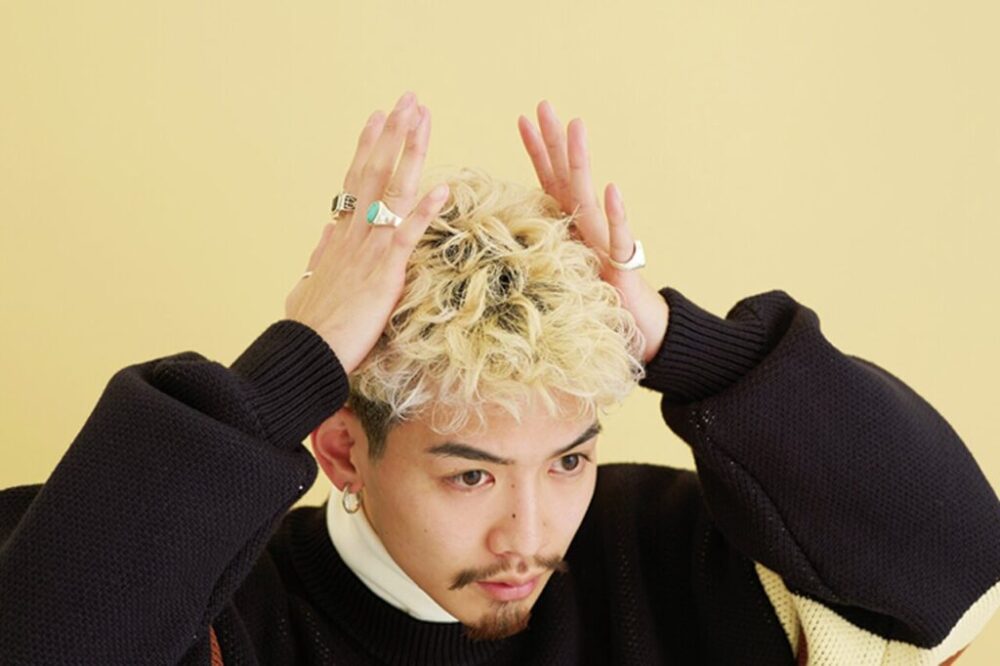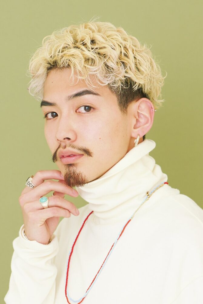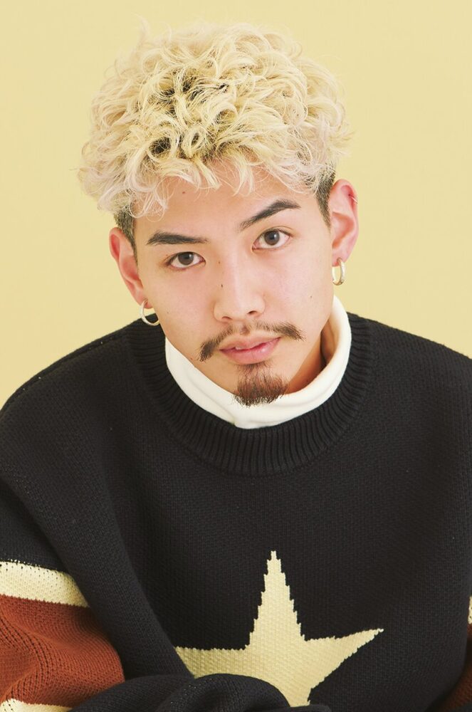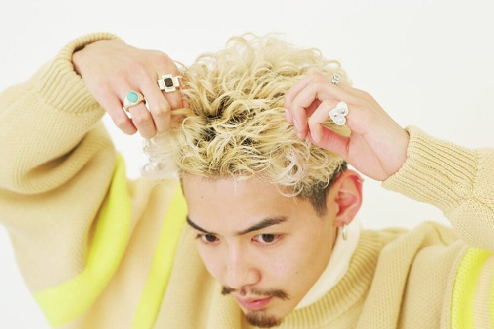 6:4で分けて、クリーム系ワックスをなじませ全体を少し落ち着かせる。動きをセーブしたぶん、柔らかな雰囲気になり、ハイトーンパーマのイカつさもナチュラルに。