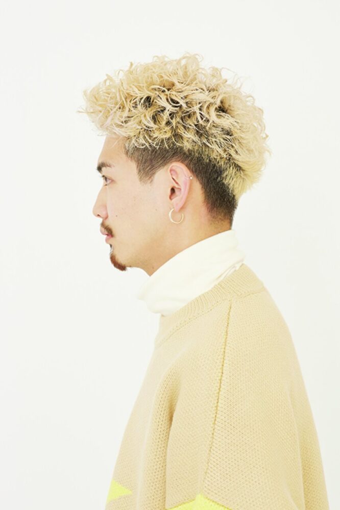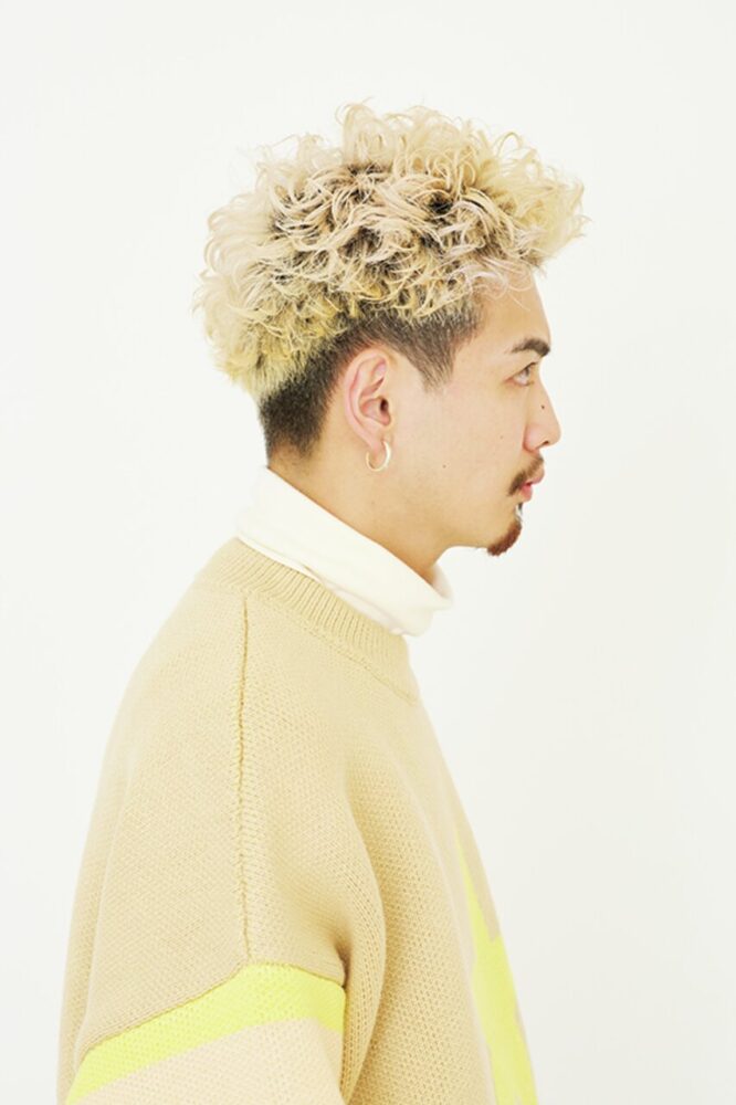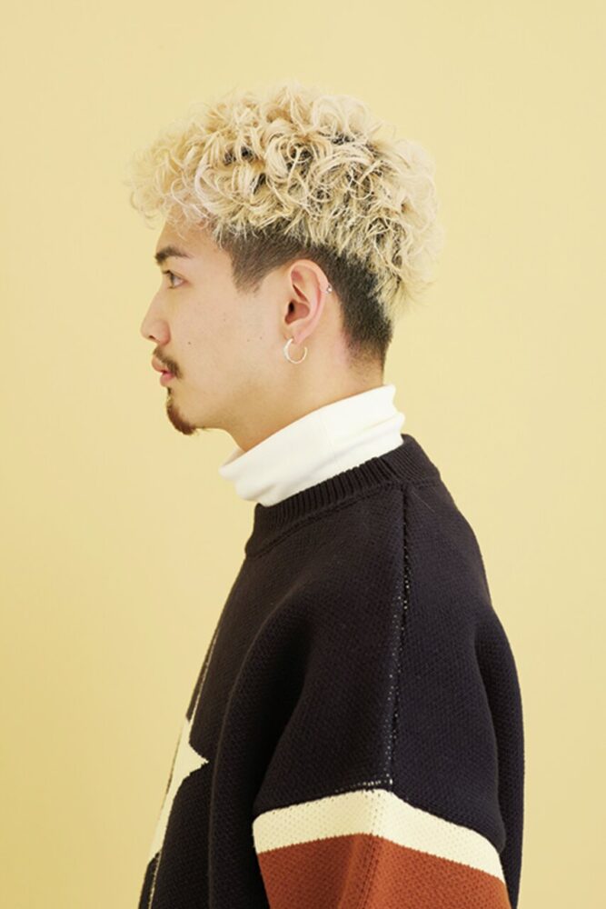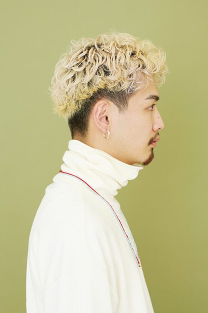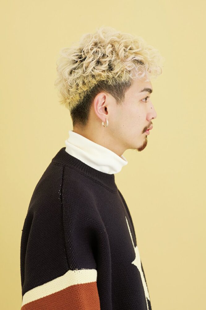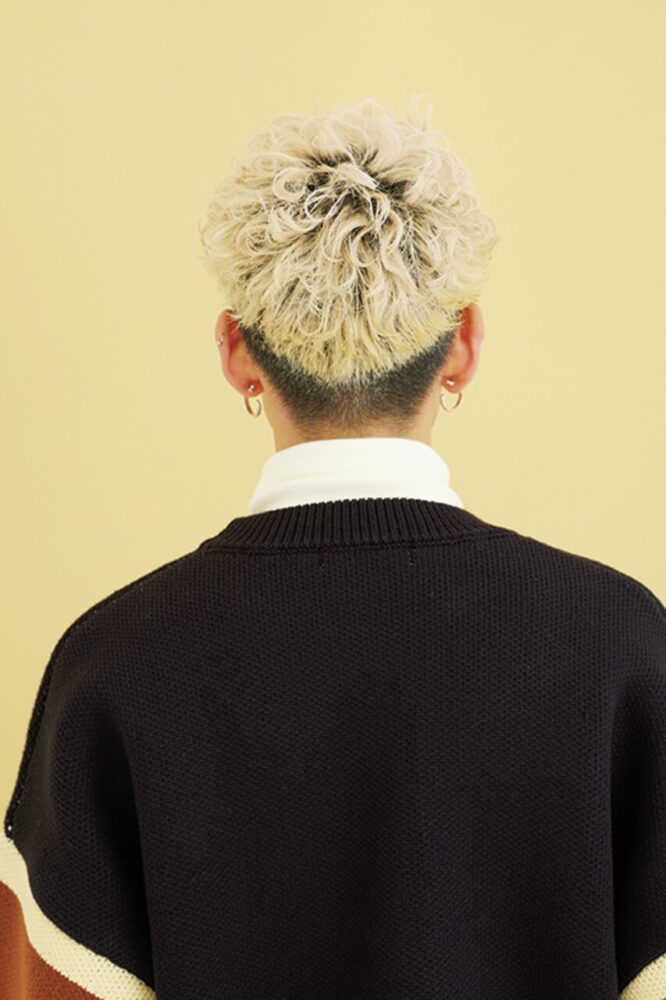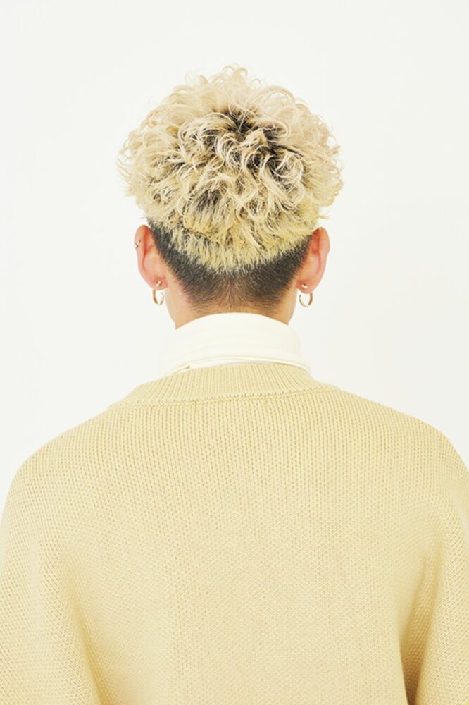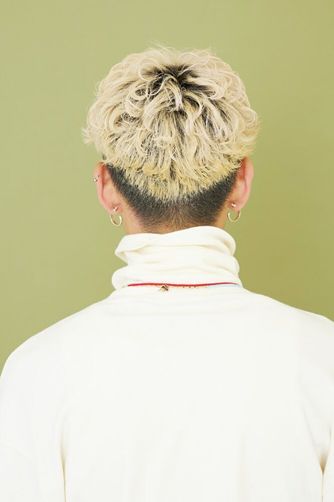 カット/トップはパーマでボリュームが出るため、ハチ下は短く刈上げたツーブロで引き締めすっきりと。ハチ上はセイムレイヤーでカットし、バックは刈上げとゆるくつなげる。パーマ/トップは全体にピンパーマをオン。すべてリバース方向に毛先を方向付けて巻く。カラー/16レベルを目指してブリーチ後、ムラサキシャンプーで流して、ホワイトゴールドに。