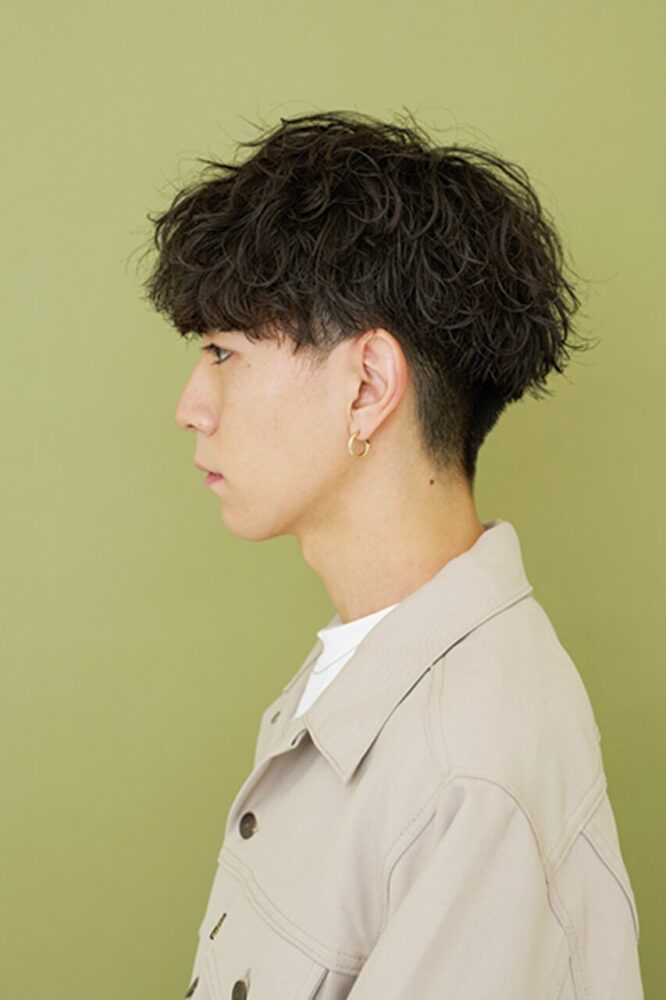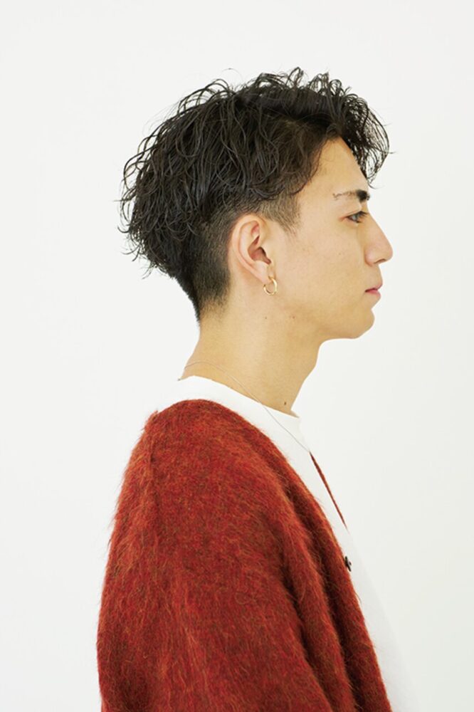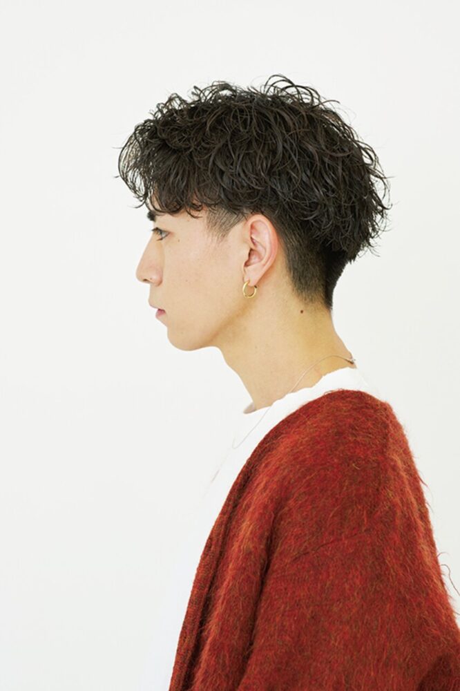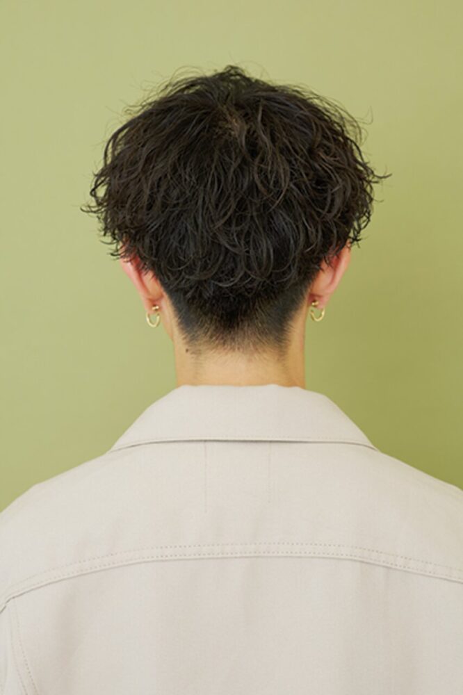 シンプルなマッシュパーマスタイル。ハーフウェット時に全体をフォワードに下ろして、ツヤの出るクリームワックスをもみ込み、束感を調整する。