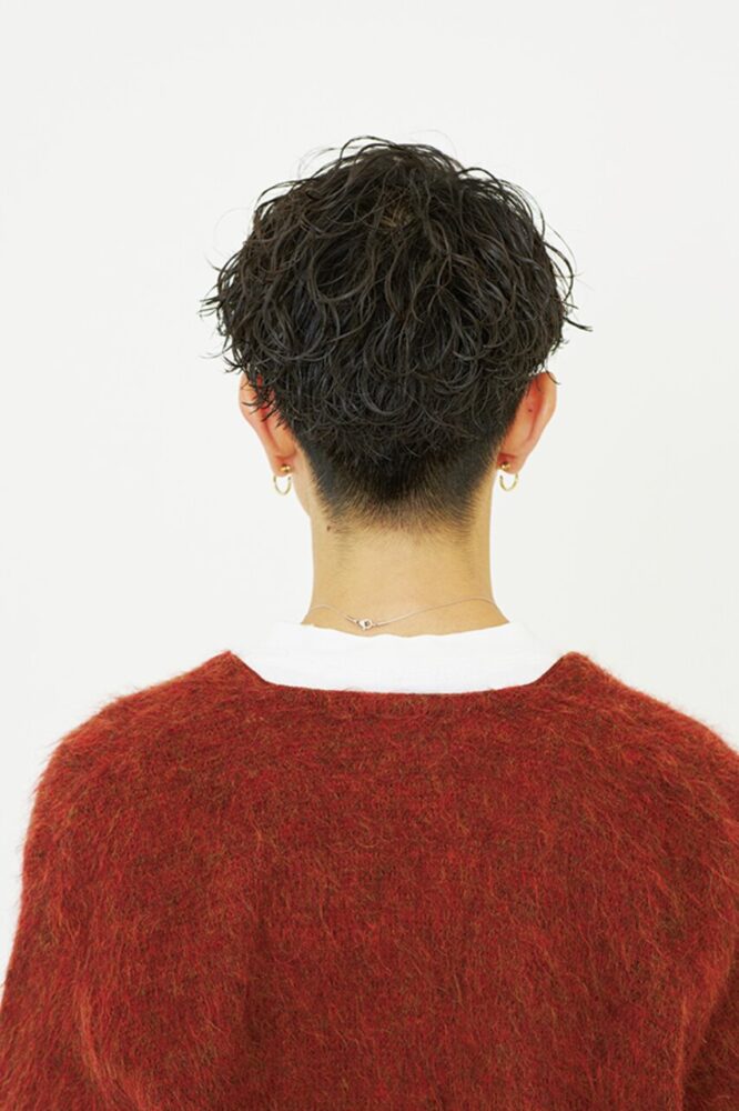 カット/ローグラデーションのマッシュベースは、トップに10㎝のレイヤーを入れてフロントにかけて長くなるようにカット。バックはあごの延長で刈上げれば、骨格補正効果抜群で美フォルムに。セイムレイヤーぎみにレイヤーをオン。パーマ/全体を波巻き。トップのみ波巻きスパイラルに巻きランダムなカールに。カラー/8レベルのアッシュブラウン。