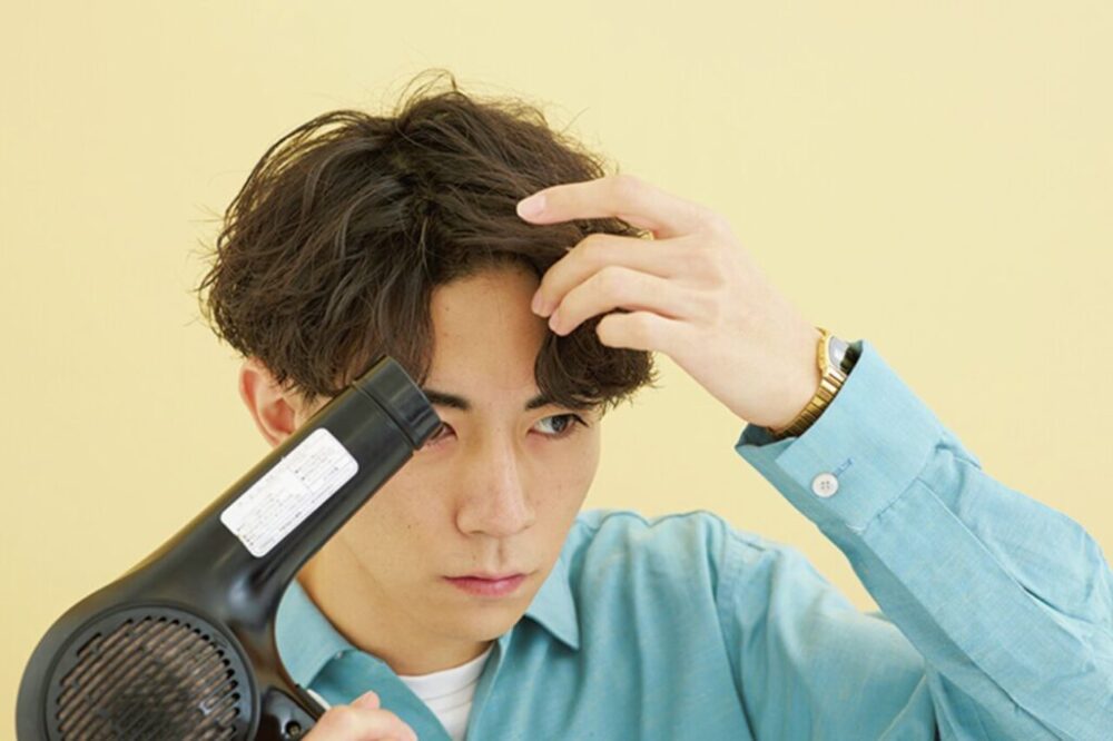 柔らかめのジェルとクリームをなじませパーマの動きを出したら、分けたバングの根元にドライヤーを当ててクセづけする。