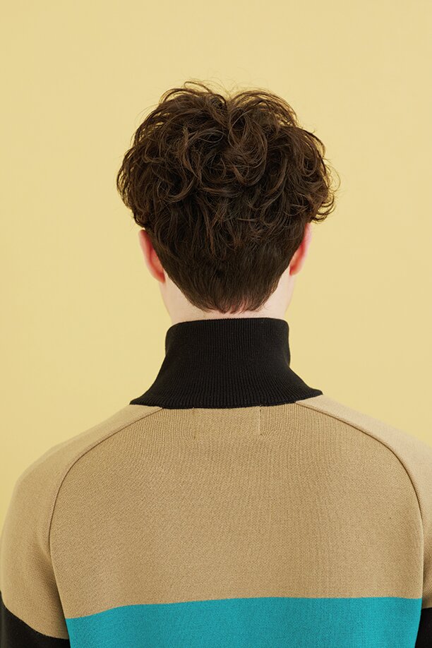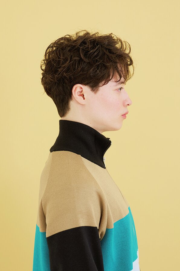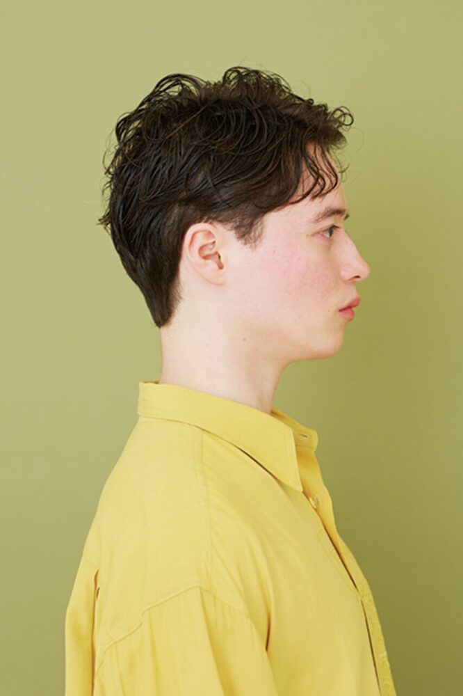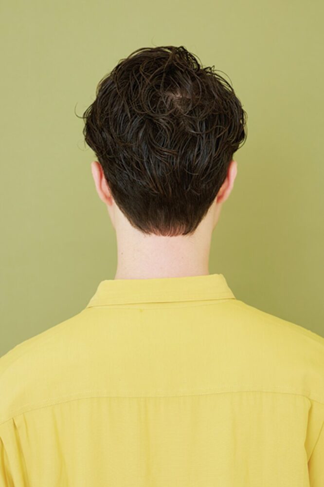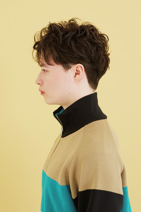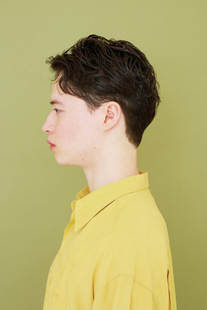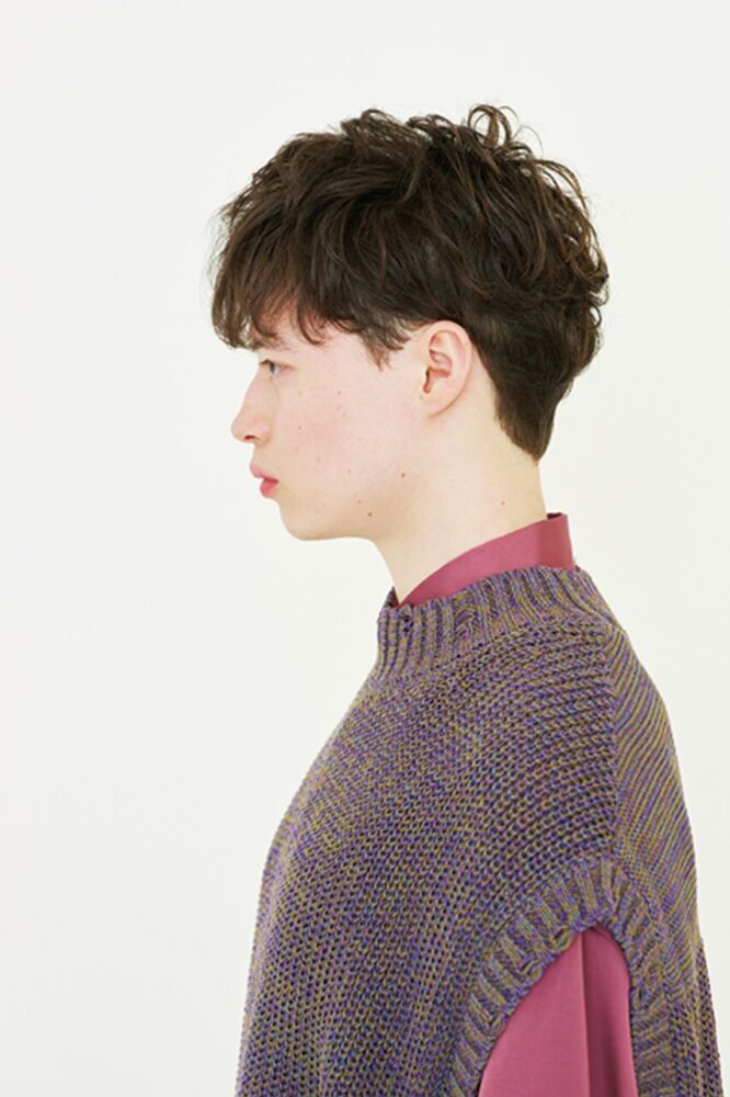 カット/クセ毛を生かした動きのあるマッシュショート。サイドはこめかみ下でツーブロックぎみに甘めに刈上げ引き締める。バックはぼんのくぼより下は刈上げない程度に短くカット。クセを生かすため全体的に深めのチョップカットでレイヤーを入れることで、毛先に長短がついて髪が動きやすくなり、自然と束感もできる。前髪は上げ下げがしやすい眉ラインに設定。