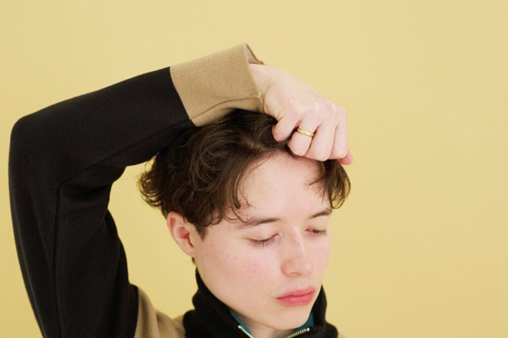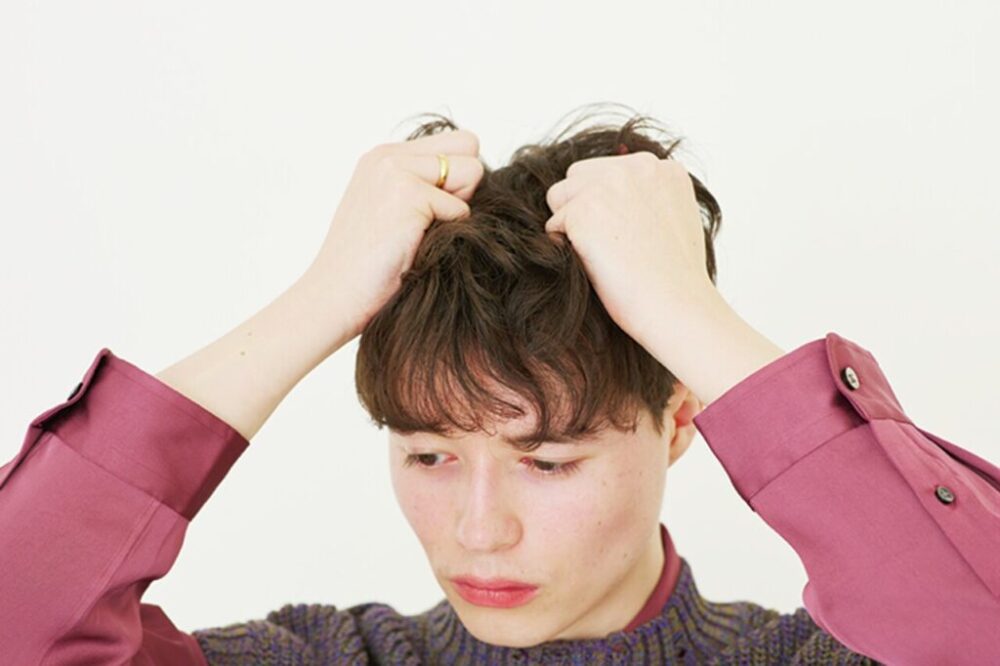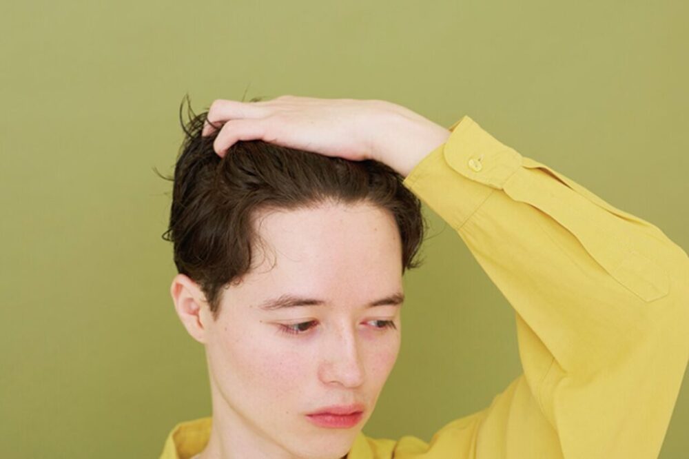 ジェルワックスをなじませクセ毛を大胆に動かす。前髪はセンターをややズラして分けて根元から立ち上げる。