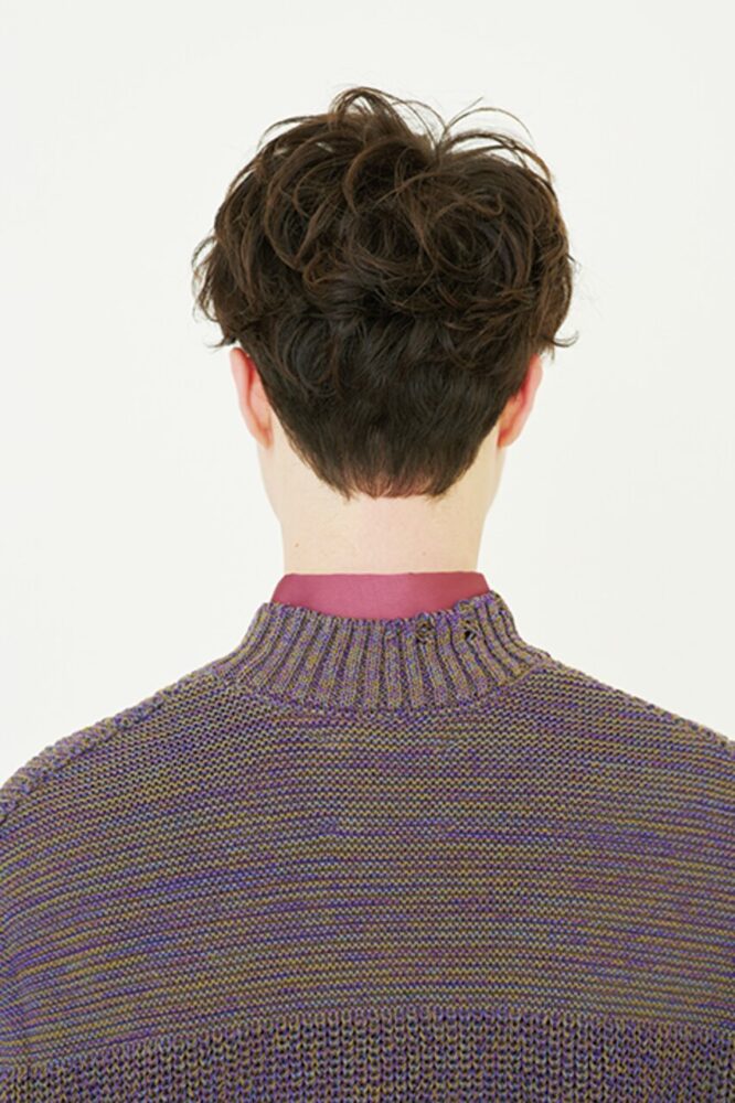 前髪は根元から立ち上げてリバース方向に流す。その際握り込みながら流すことでクセの動きもより引き出される。