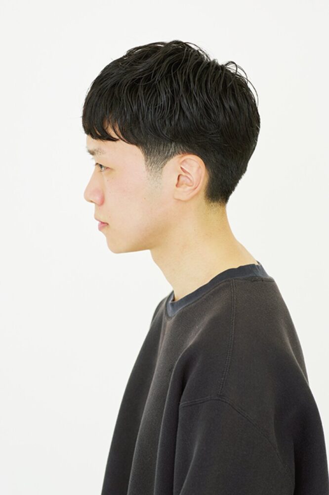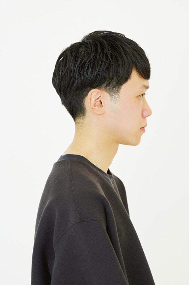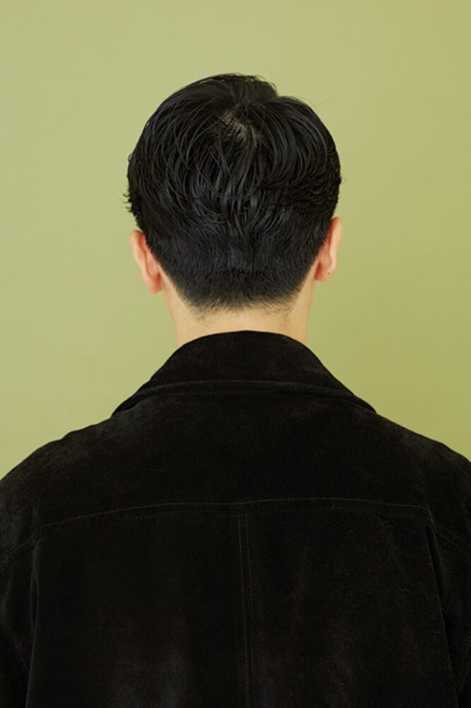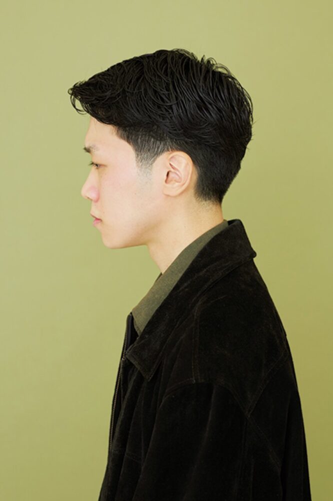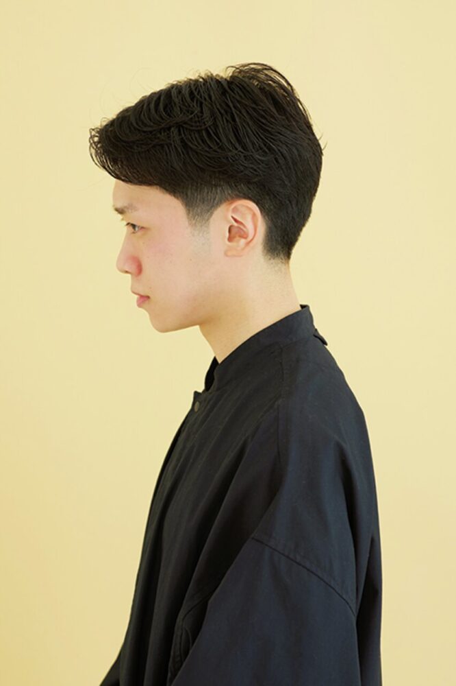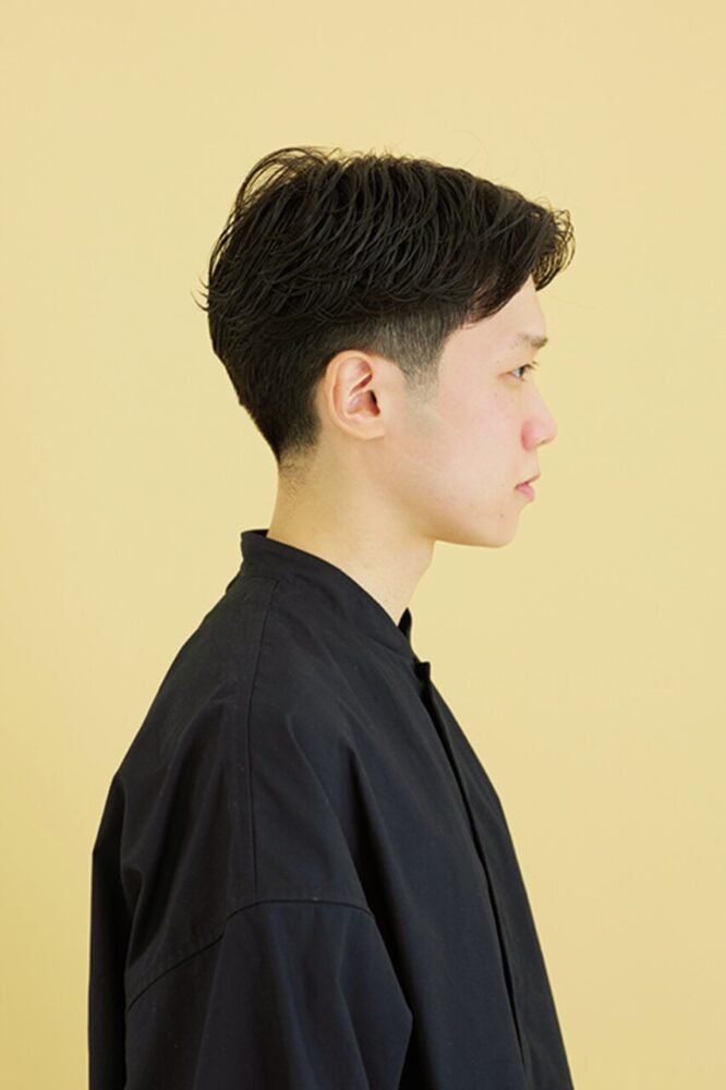 カット/サイドはこめかみから9〜6㎜に刈上げてツーブロックに。もみあげやえり足のキワはトリマーで3〜1㎜程度にぼかして引き締め。バングは上げ下げしやすい目上ラインに設定。トップはセニングでザクザクとカットし動きやすくする。パーマ/直毛のため、軽くパーマをかけると動きやすくなりアレンジ幅も広がる。全体的に14〜13㎜のロッドで平巻きパーマを。