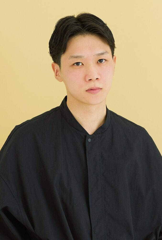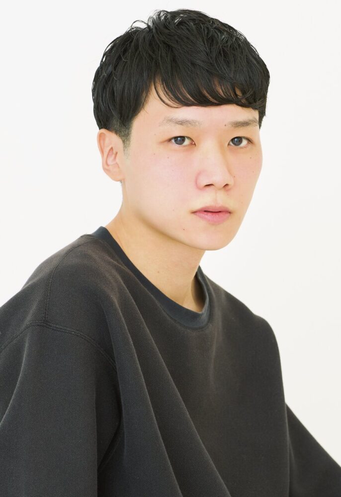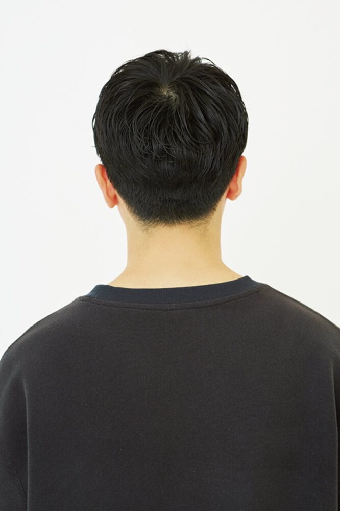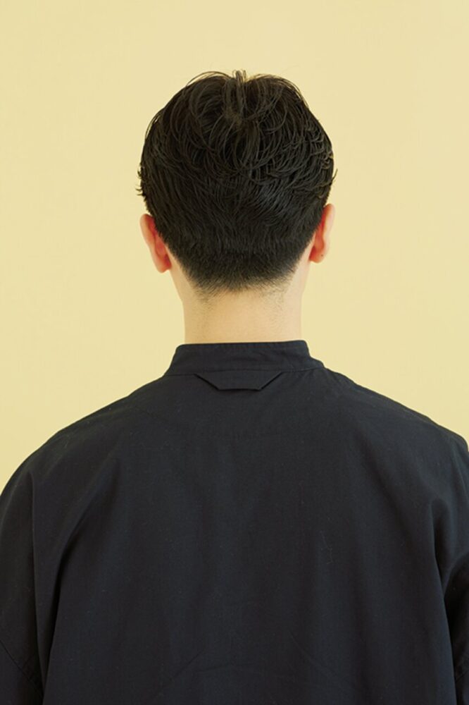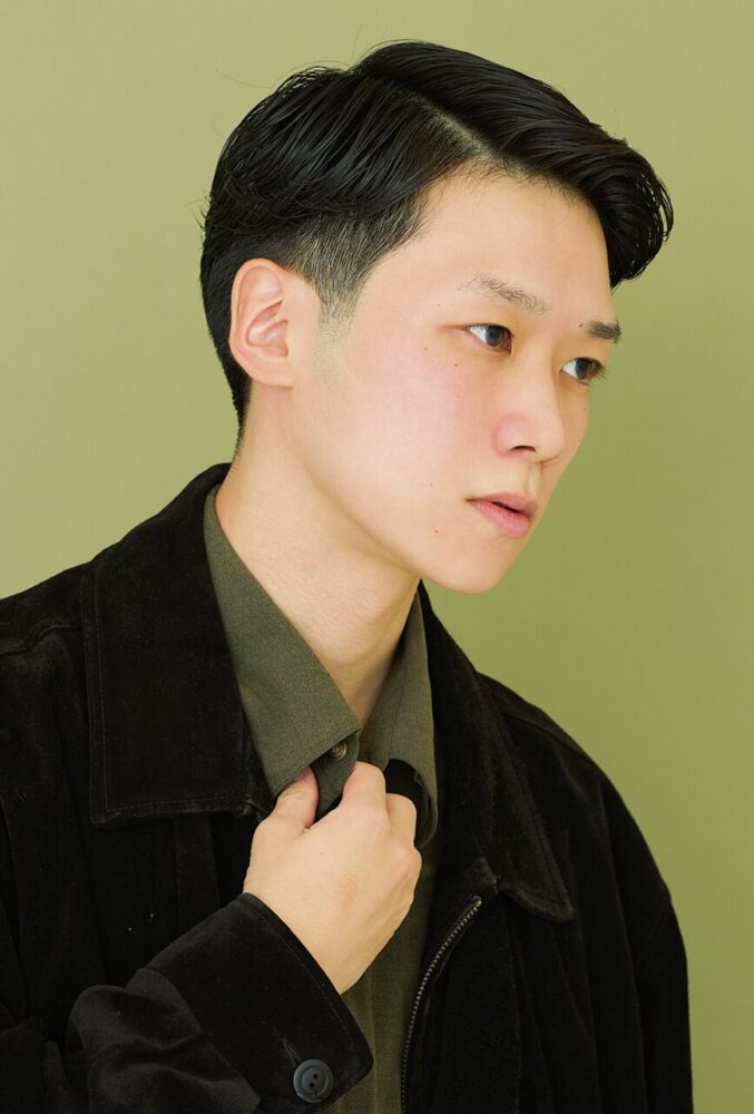 カット/サイドはこめかみから9〜6㎜に刈上げてツーブロックに。もみあげやえり足のキワはトリマーで3〜1㎜程度にぼかして引き締め。バングは上げ下げしやすい目上ラインに設定。トップはセニングでザクザクとカットし動きやすくする。パーマ/直毛のため、軽くパーマをかけると動きやすくなりアレンジ幅も広がる。全体的に14〜13㎜のロッドで平巻きパーマを。