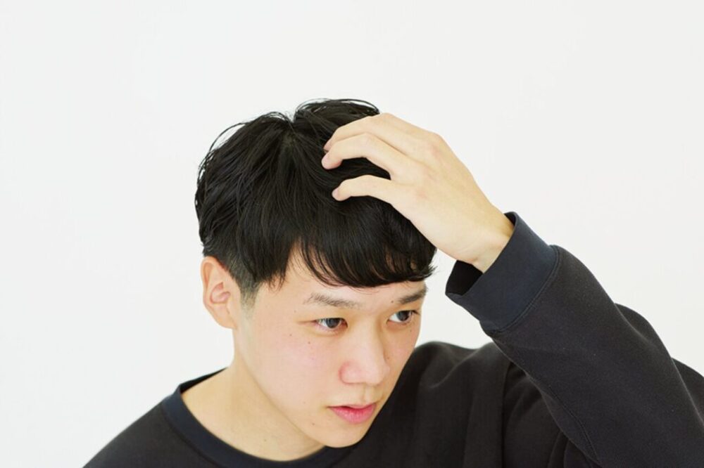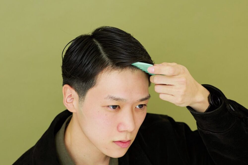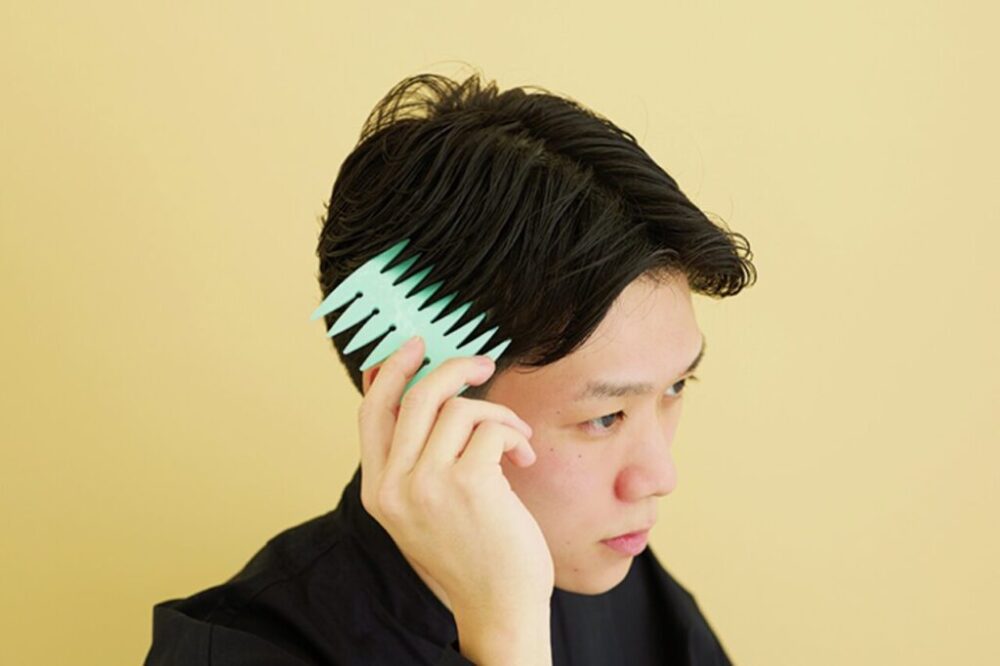 グリースを全体になじませて濡れ感を出し、8:2でパートをつけながら分ける。ヘビーサイドはコームで根元から起こす。