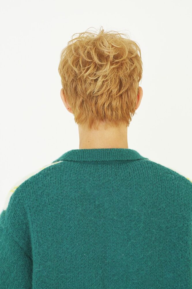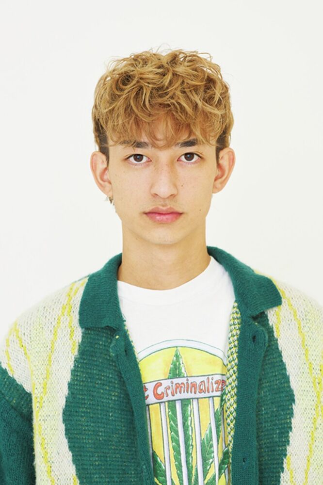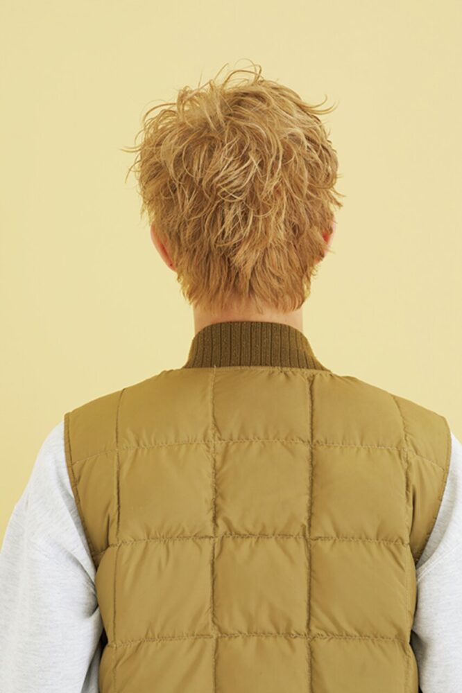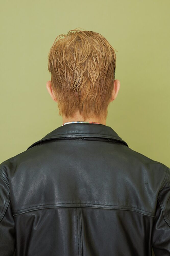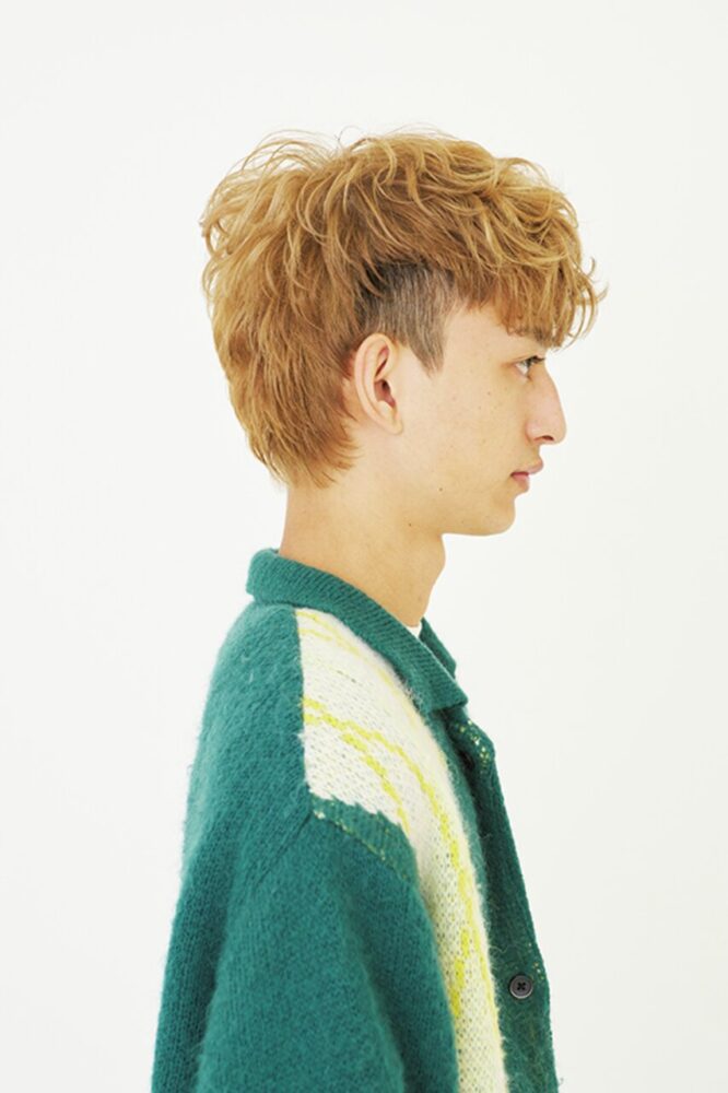 カット/ハチ下は耳後ろまでを広めに刈上げてツーブロに。サイド〜前髪は前下がりにグラデーションを効かせながらカット。えり足はやや角を残してウルフ感もプラス。パーマ/トップは縦巻きのスパイラルをゆるめにかけて、バックの短い部分はピンマーマでなじませる。カラー/14レベルにブリーチ後、11レベルのプラチナベージュをオンカラーし透明感ある髪色に。