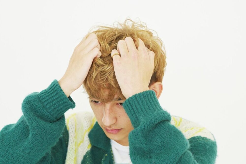 ワックスを全体になじませ、根元から握ってパーマのカール感をメイク。前に毛流れを寄せるイメージで。