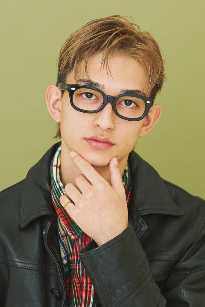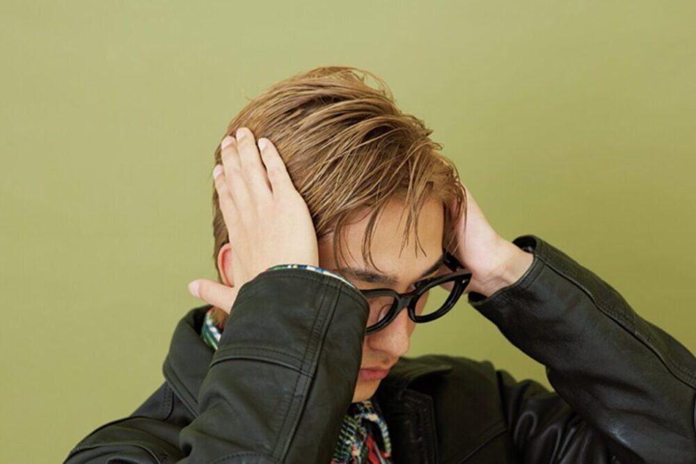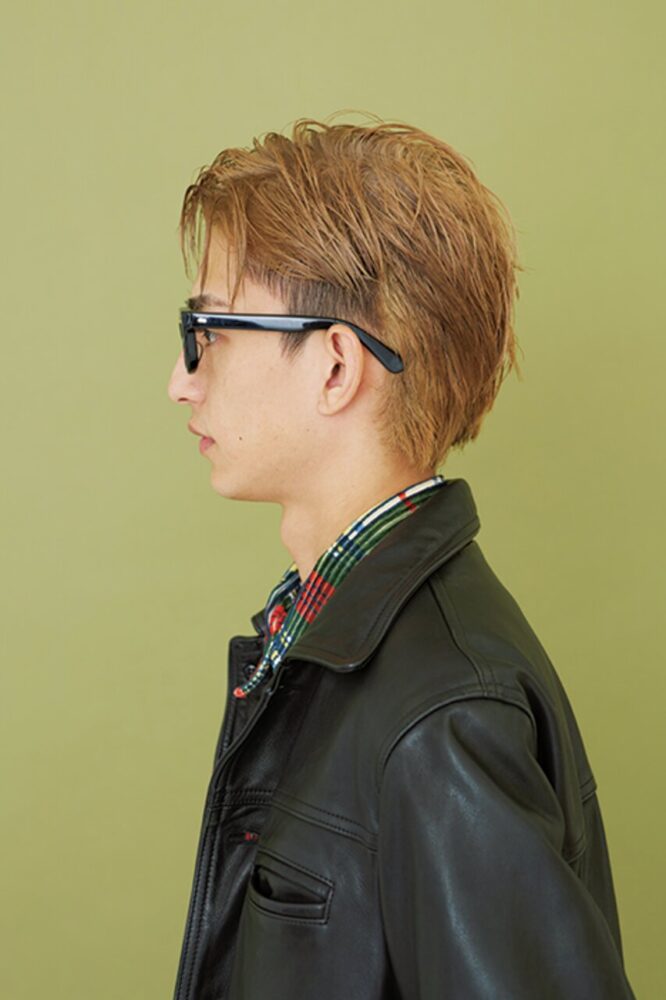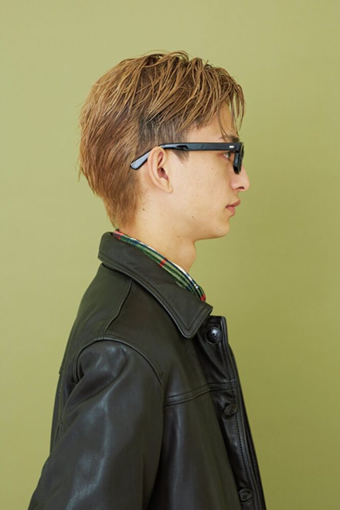 分け目がつかないよう自然にサイドパートで分け、両サイドはタイトに耳かけ。バングもラフに立ち上げて顔まわりをスッキリとさせればクールな知的顔に一変。