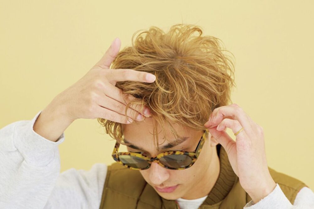 全体にグリースをなじませツヤ感を引き出しつつ、無造作なカールの動きをメイク。ところどころハネ感も加えてボリュームを出す。