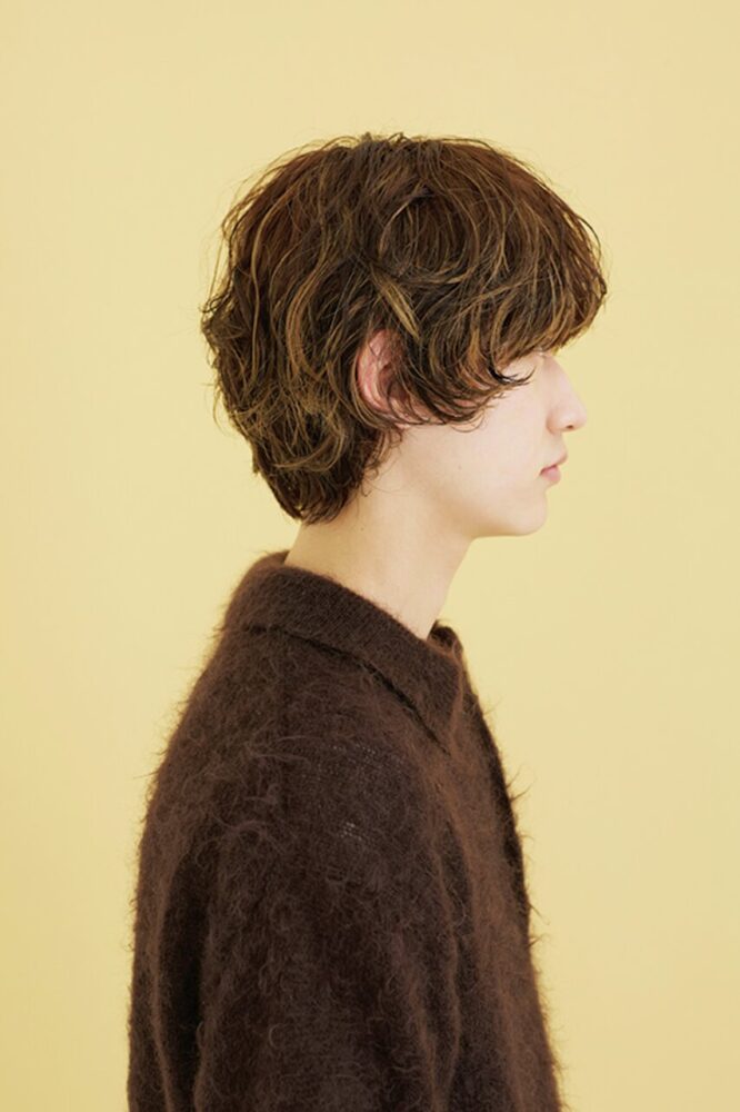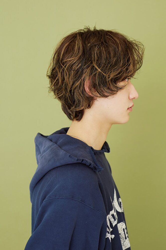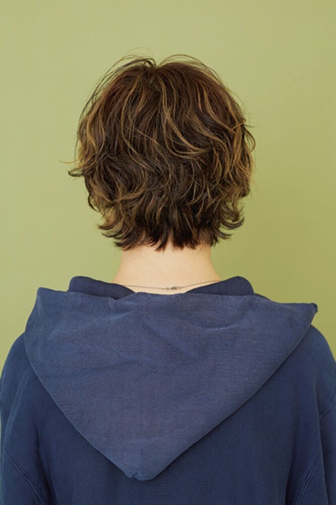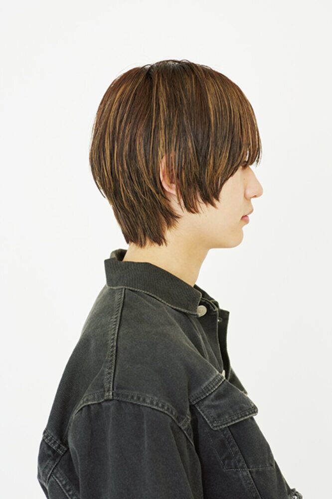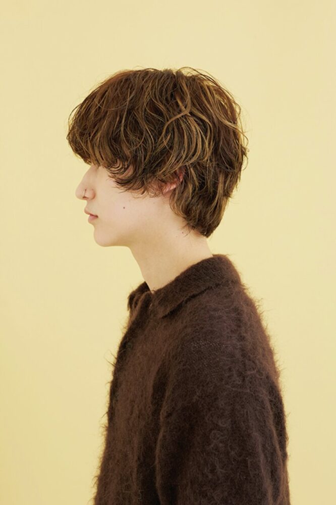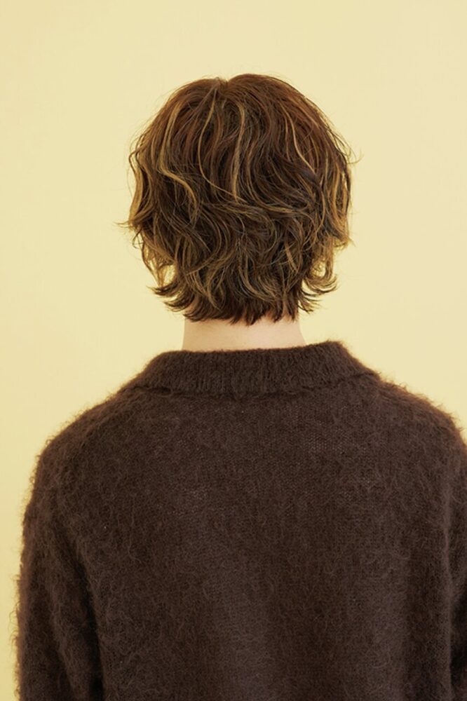 ランダムなハイライトカラーが、キメすぎないラフな質感にリーチ。自然な立体感で、まるで外国人のようなネイティブ感溢れるカラーリング。もともとのクセを存分に生かしたカットでマッシュウルフに抜け感が生まれた。