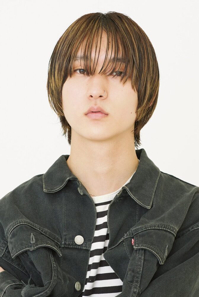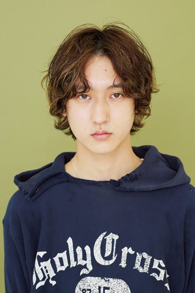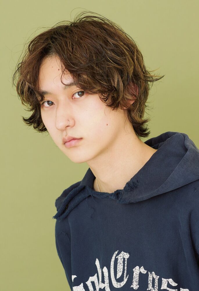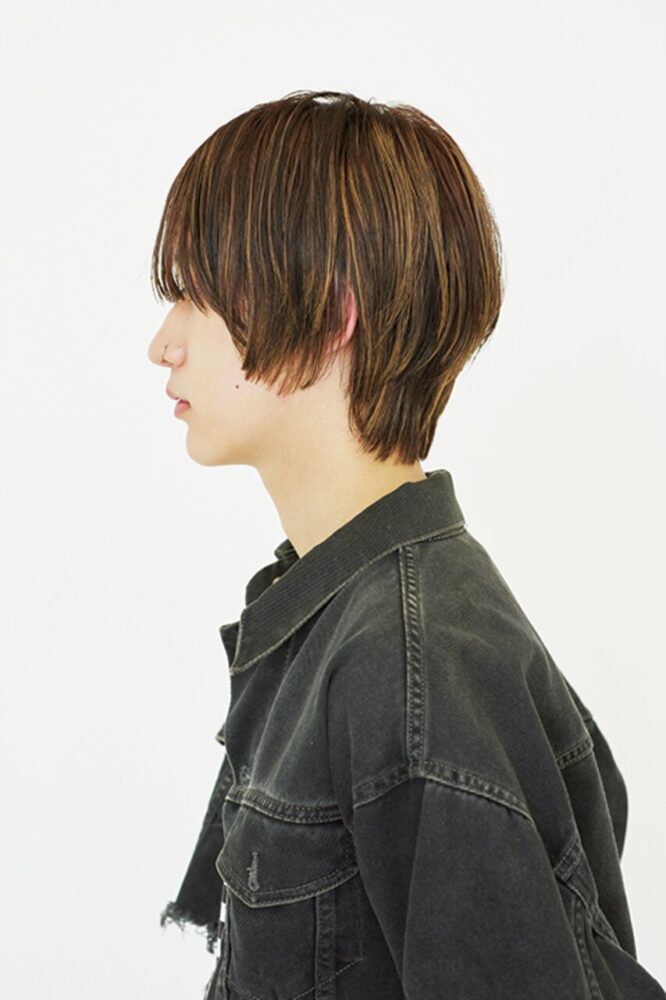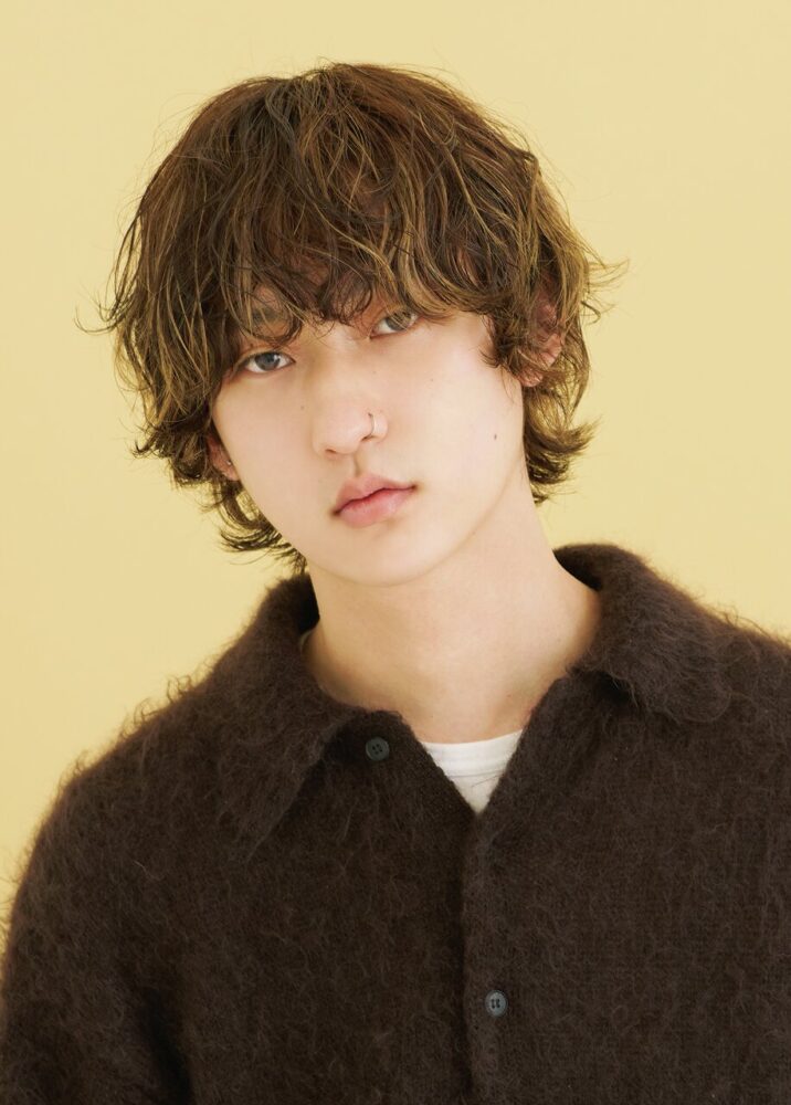 ランダムなハイライトカラーが、キメすぎないラフな質感にリーチ。自然な立体感で、まるで外国人のようなネイティブ感溢れるカラーリング。もともとのクセを存分に生かしたカットでマッシュウルフに抜け感が生まれた。