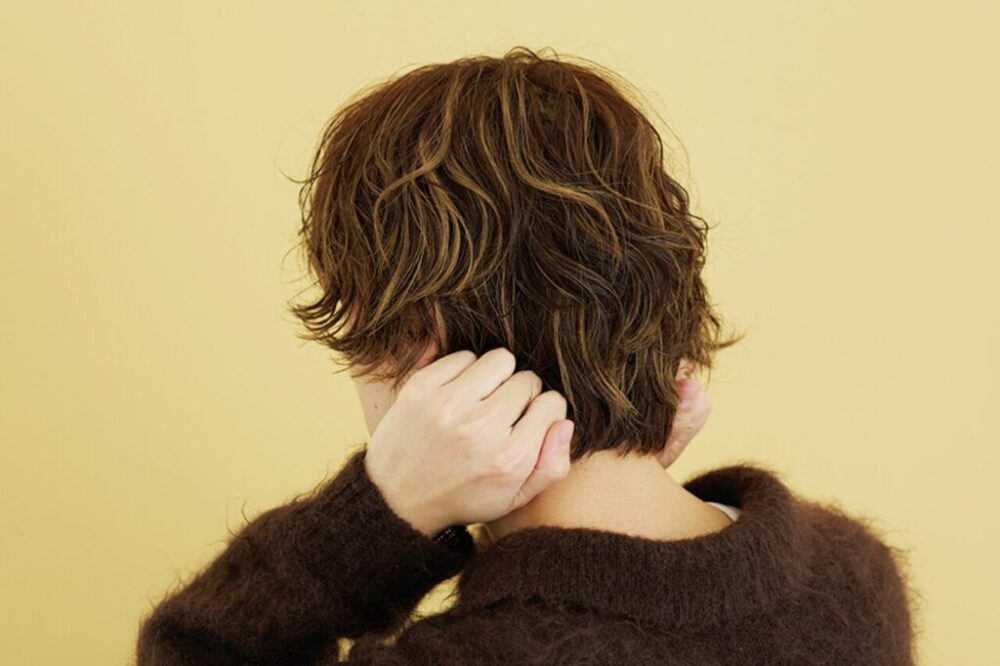 クセを強調させるようセラムをなじませてもみ込む。えり足はハネさせて前から見たとき毛先が見えるよう調整。