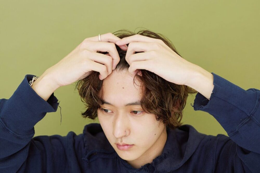 ドライクリームとセラムを混ぜたものを塗布しセンターパートで分ける。根元は少し立ち上げつつ毛先は無造作にハネさせる。