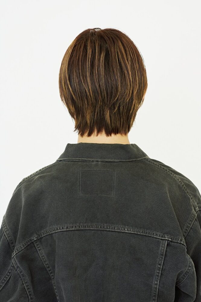 カット/毛先にブラント感を残したマッシュウルフ。もともとのクセを生かすようにスライドカットで軽さづけしながらカット。前髪は目下2㎝のシースルーバングに。カラー/ランダムなハイライトカラーになるようエアタッチというカラーテクでブリーチ。根元3㎝を空け、全体の1/3をブリーチ。その後、根元は8レベル、毛先は10レベルのアッシュブラウンをオンカラー。