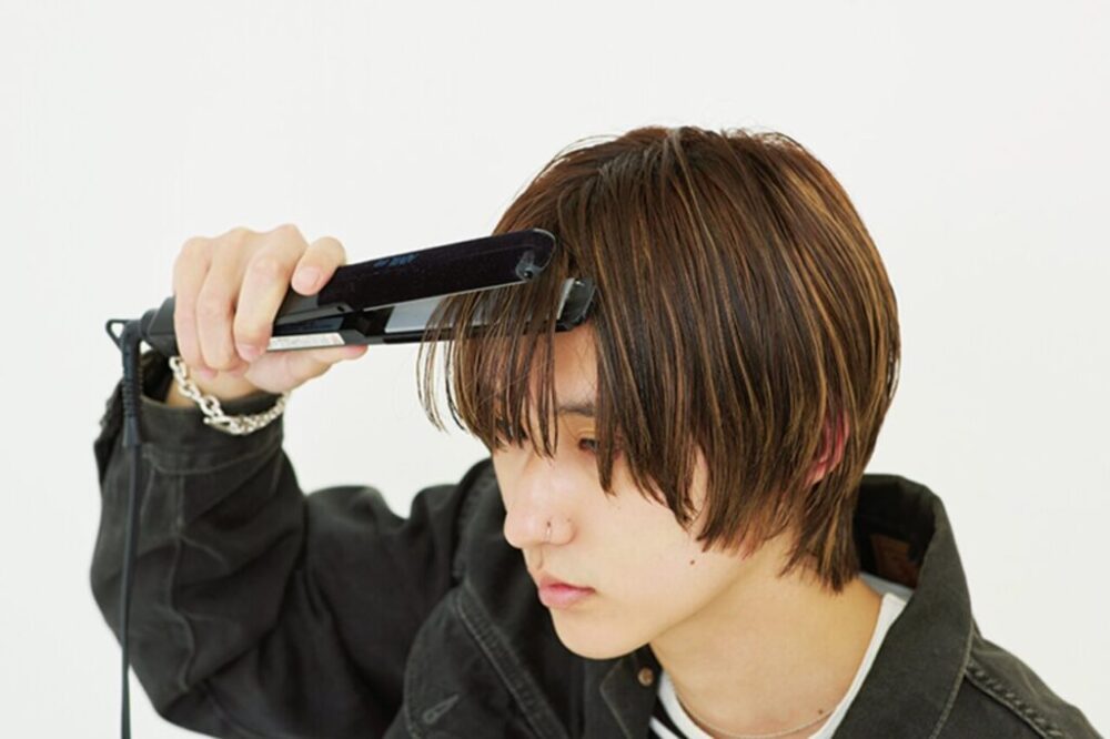 ストレートアイロンで根元からクセをのばす。オイルを全体になじませ束感をつくり、前髪はシースルーバングに調整。