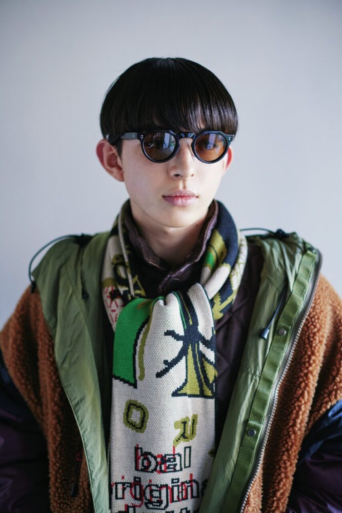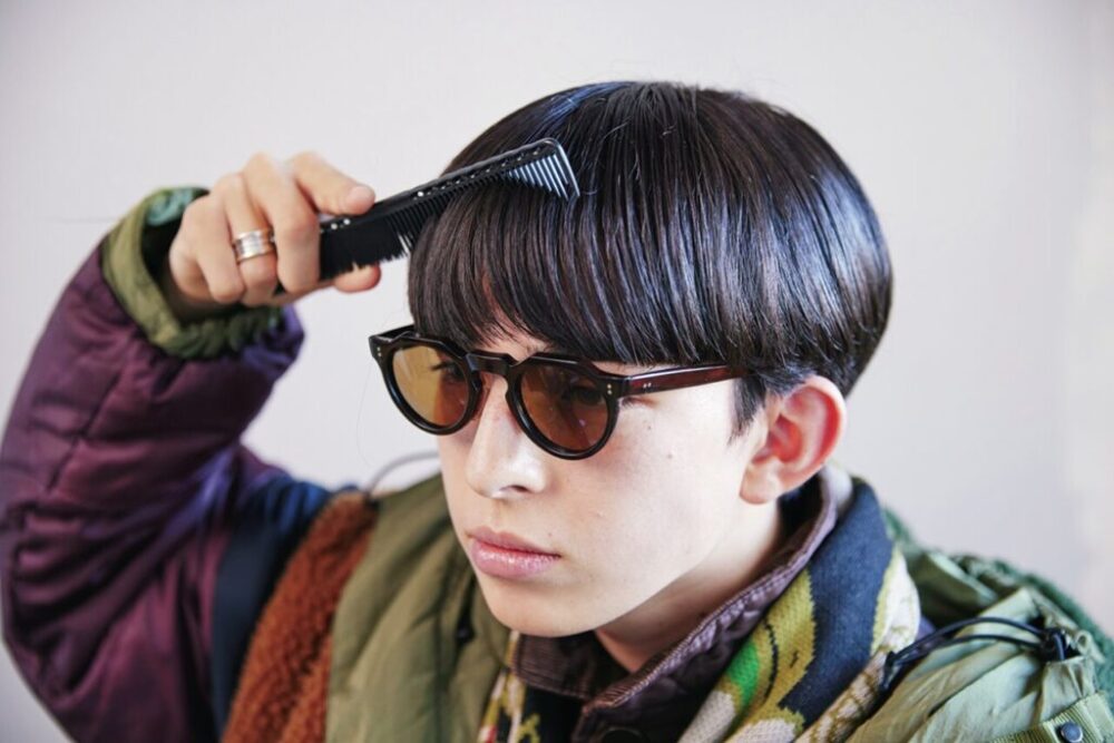 トレンドのクラウンパントフレーム×サングラスという主張強めのメガネは、シンプルかつタイトなツーブロックのパッツンマッシュを合わせるとバランスがいい。ファッションで柄物を投入することで遊びを入れつつ、トラッド感のある服選びで上品に見せることも忘れずに。