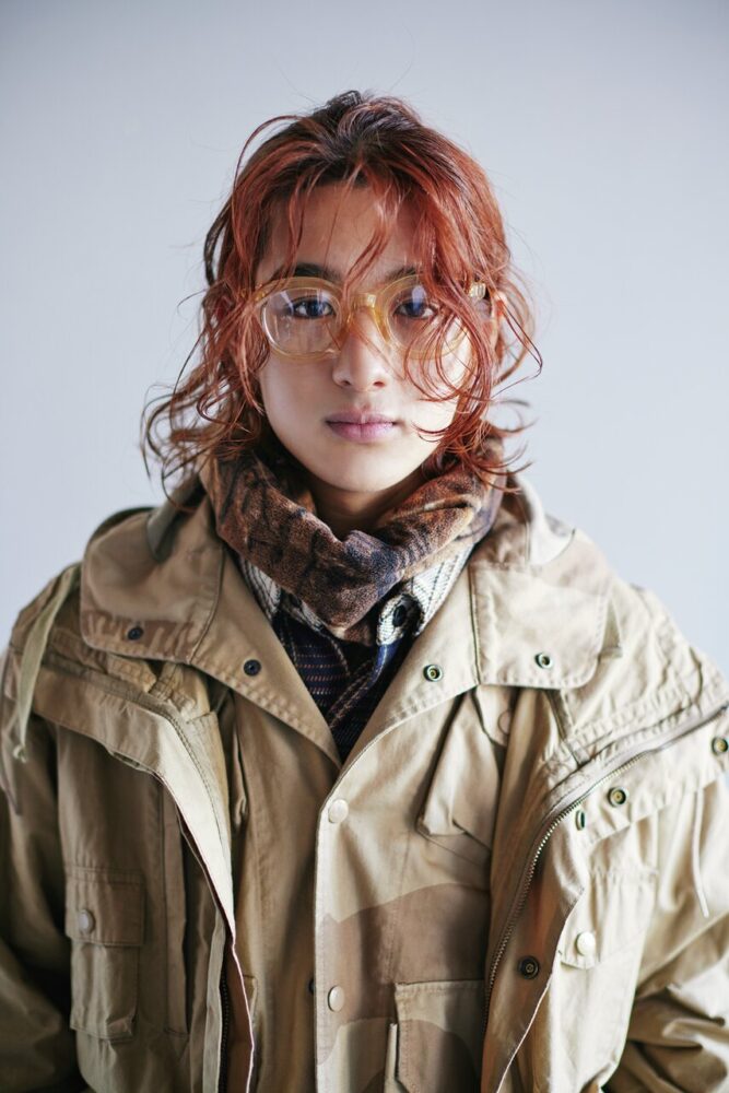ベージュをベースに、チェックと2種類の迷彩をファッションに取り入れたぶん、ゆるふわパーマのボブヘアはハーフアップでタイトに。情報量が多いので、メガネはクリアをチョイス。フレームの存在感はあるものの、クリアだからさりげなく主張できるし、柔らかい印象に。
