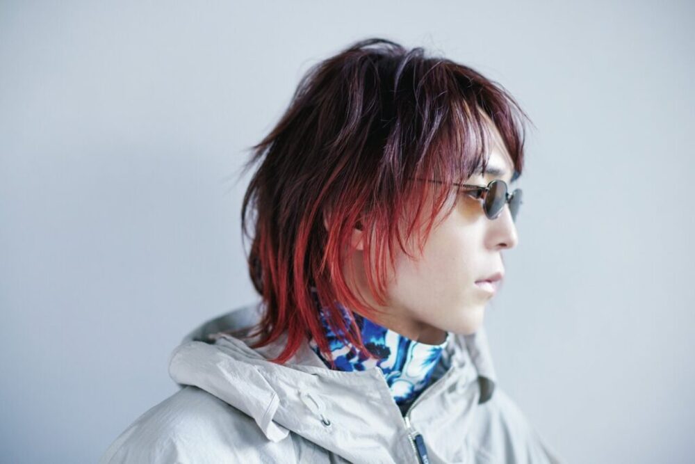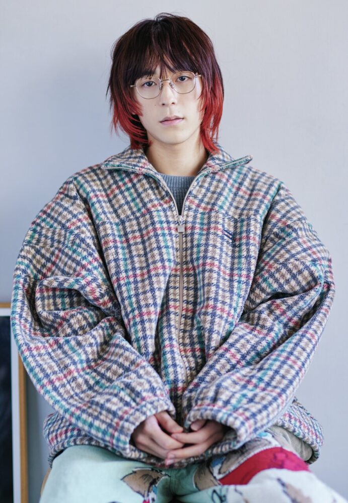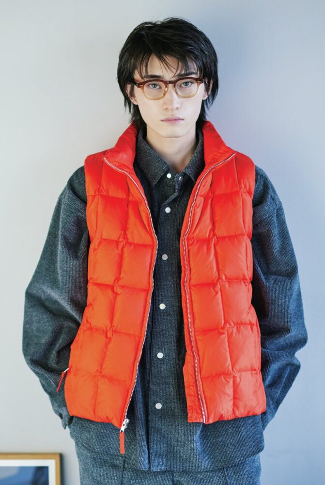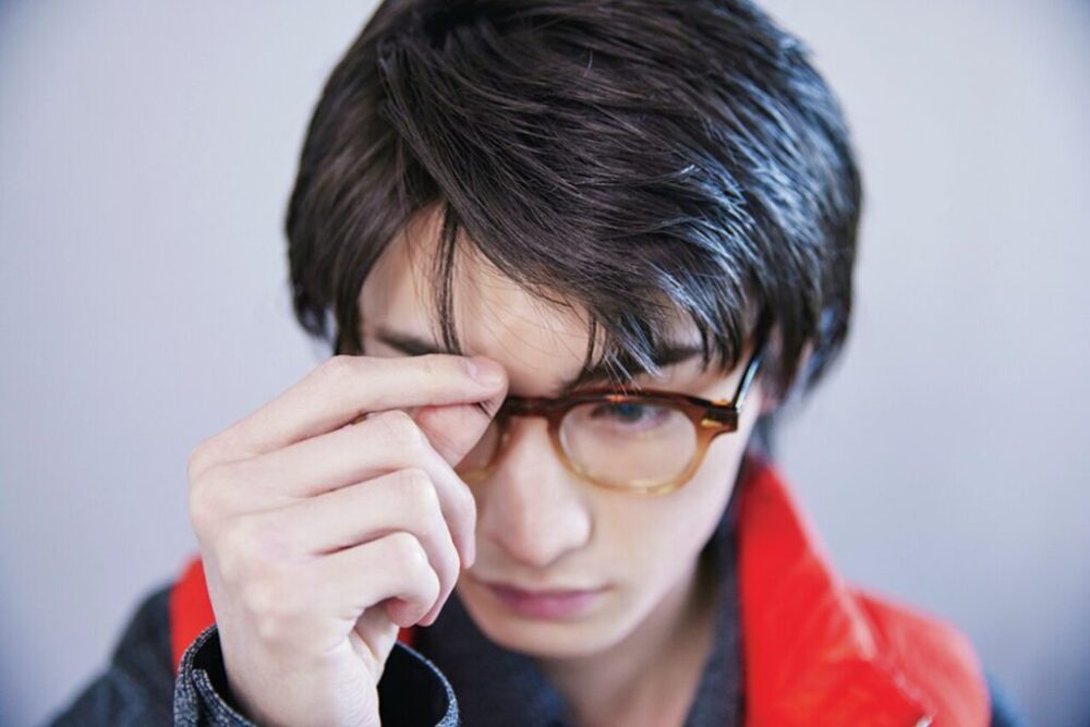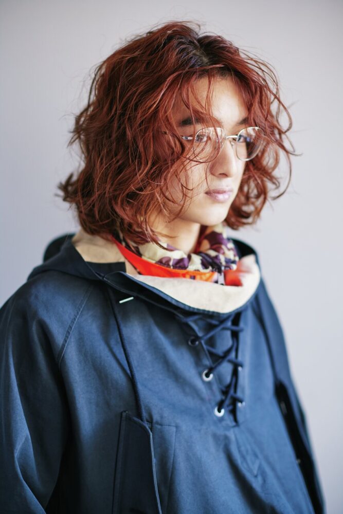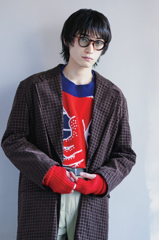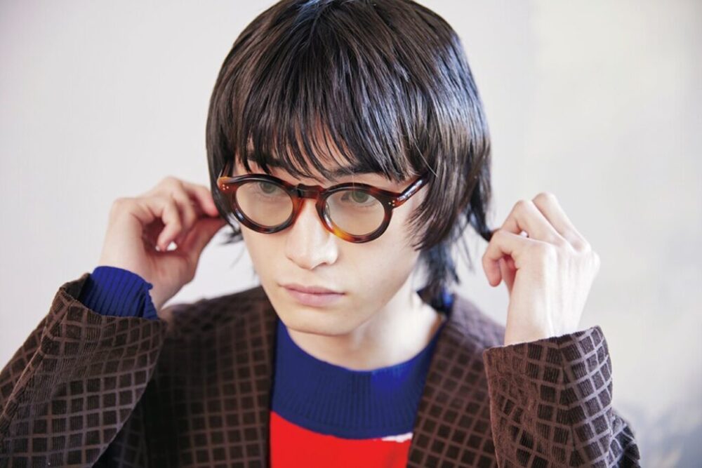 薄く色が入ったカラーレンズ×クラウンパントフレームの主張強めメガネ。ヘアは前髪を下ろしてナチュラルにしてバランスを取った。カラーレンズのヤンチャな印象にもっていかれないよう、ジャケットで引き締めつつ、インナーの赤ニットを合わせることではずしを入れた。