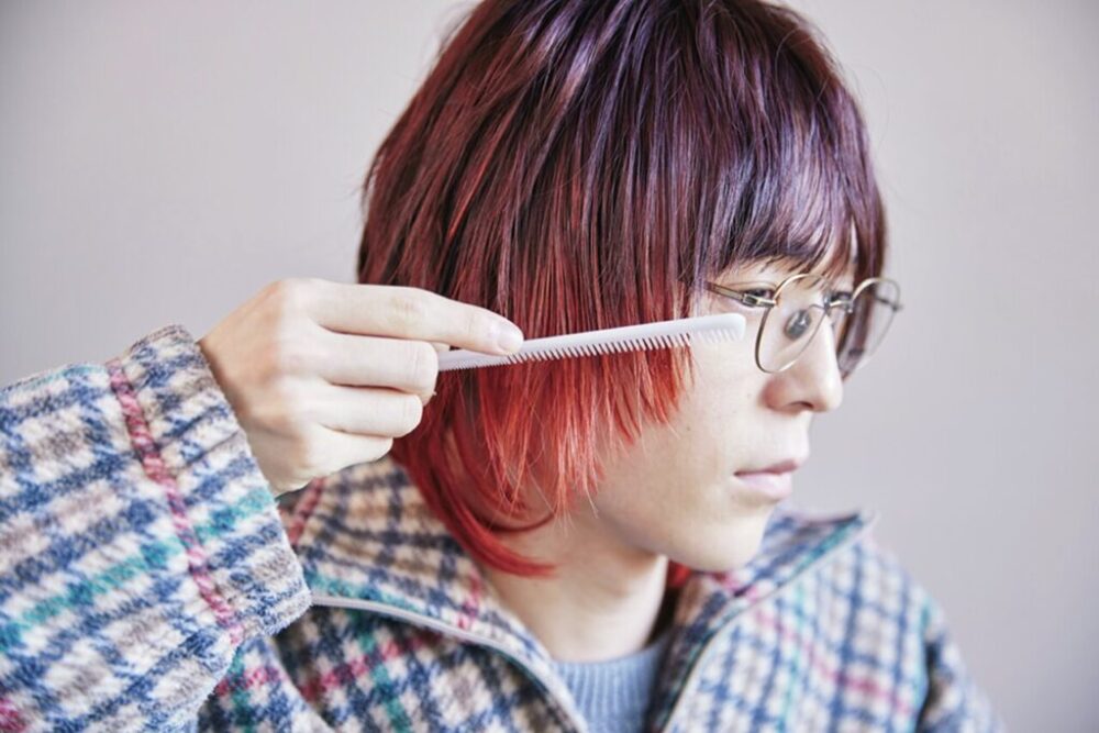 バームをもみ込んだら、顔まわりをクシでコーミングして、毛流れを前へもってくる。