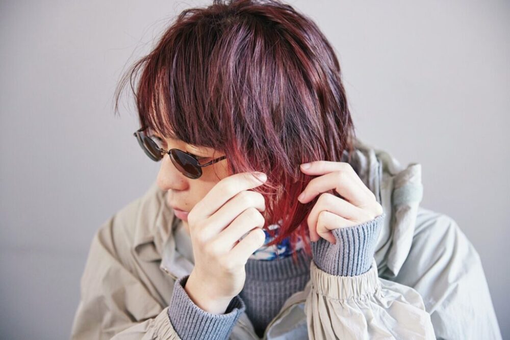 ウルフ×グラデに入れたレッドカラーが強めな印象のヘア。デニムもクセ強めなので、メガネはメタルフレームで一歩引く。あえてゴールドを選んだのは、さりげなくアウターのジッパーとリンクさせたから。メタルは知的な印象に見せてくれるから引き締め役にピッタリ。