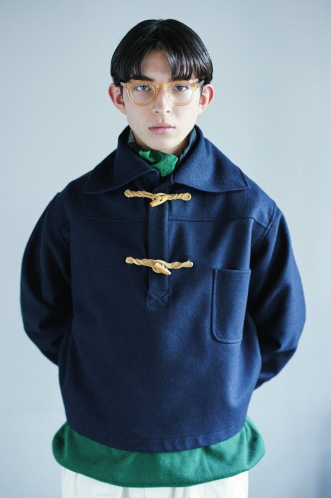 クリアのクラウンパントは、黒より印象がやさしくなるので、ちょっと背伸びしたい男のコにピッタリ。パッツンマッシュをセンターパートにして上品さをプラスし、ネイビーのキレイめコートにスカーフも巻いて。白パンツにニューバランスのスニーカーで抜け感を出した。